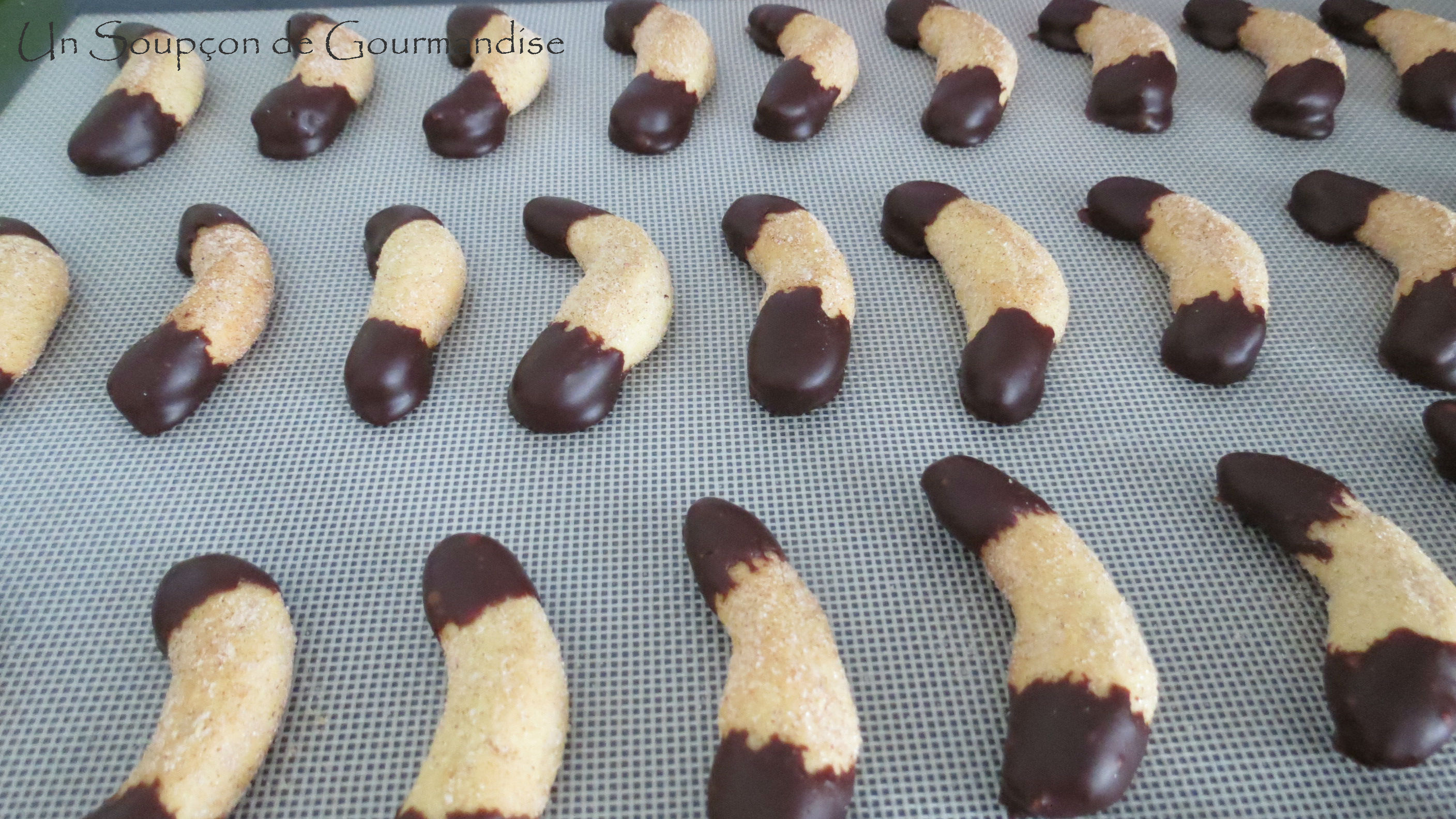 Faire fondre 100g de chocolat noir avec un peu d’eau et ajouter du sucre glace. Y tremper les extrémités des petits gâteaux et les disposer sur une grille jusqu’à ce que le chocolat durcisse.