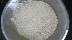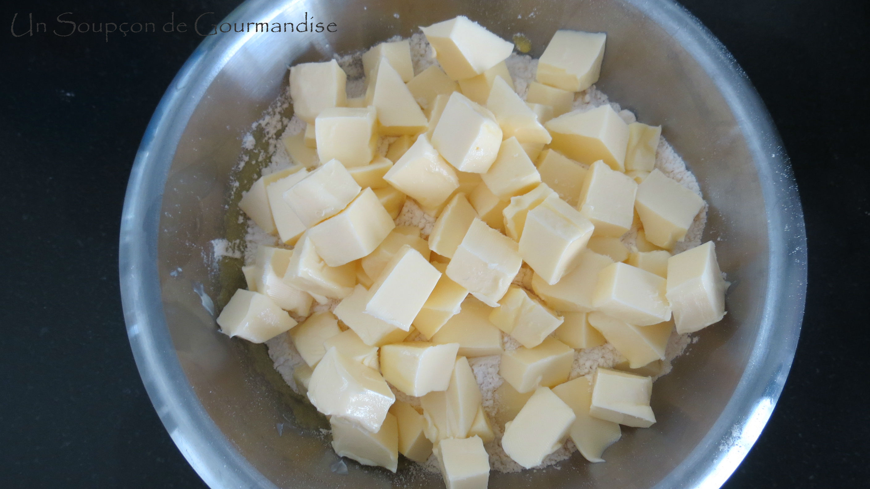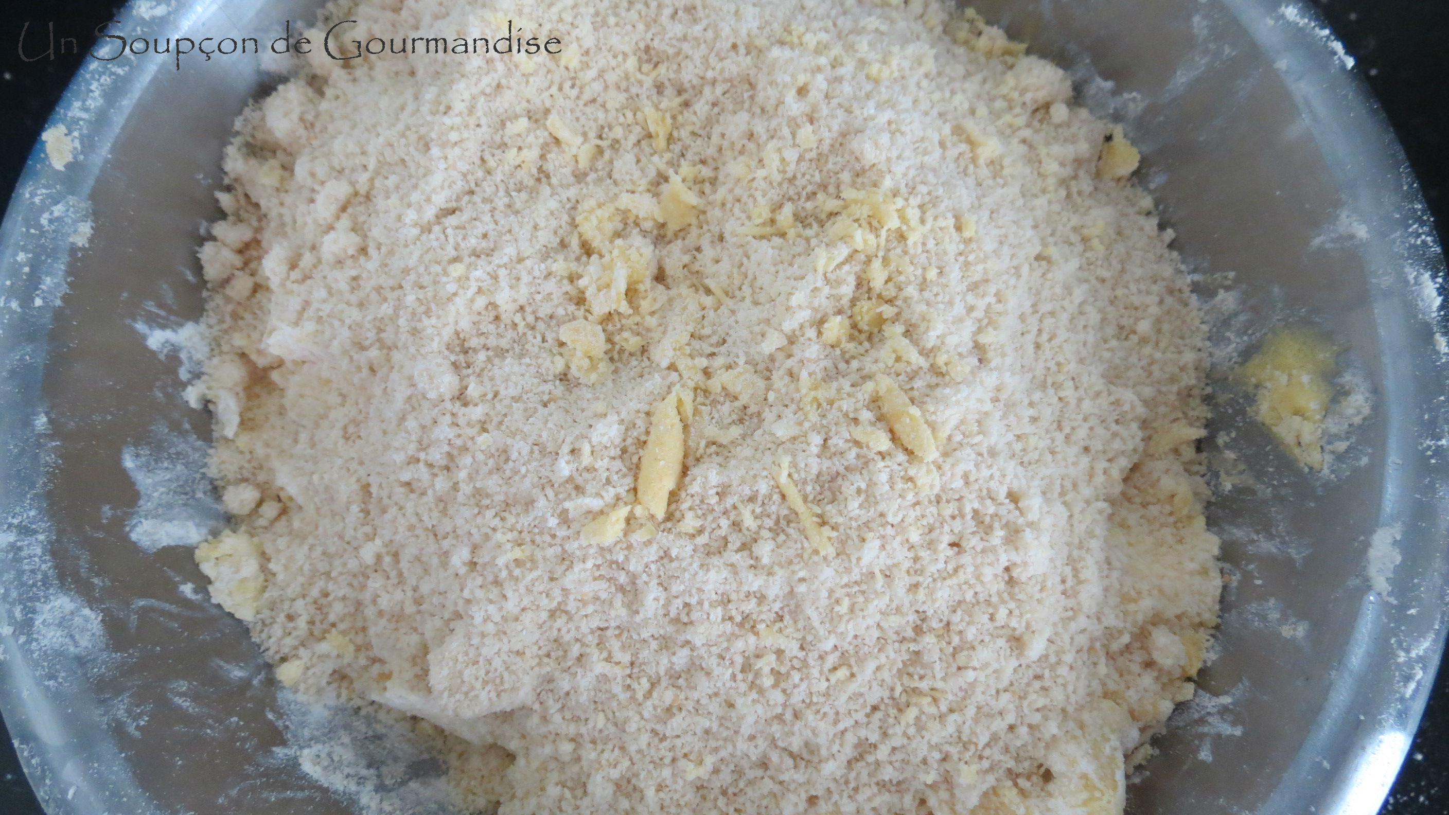 Ajouter 400g de farine, 300g de beurre mou en petits morceaux et enfin 200g de poudre d’amande.