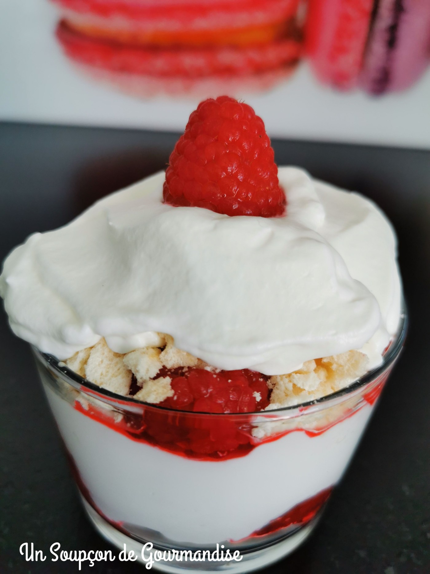 - J’ai décongelé des framboises que j’avais au congélateur, ça fait forcément du jus, pas très esthétique : lorsque c’est la saison, préférez des framboises fraîches pour un résultat encore meilleur.