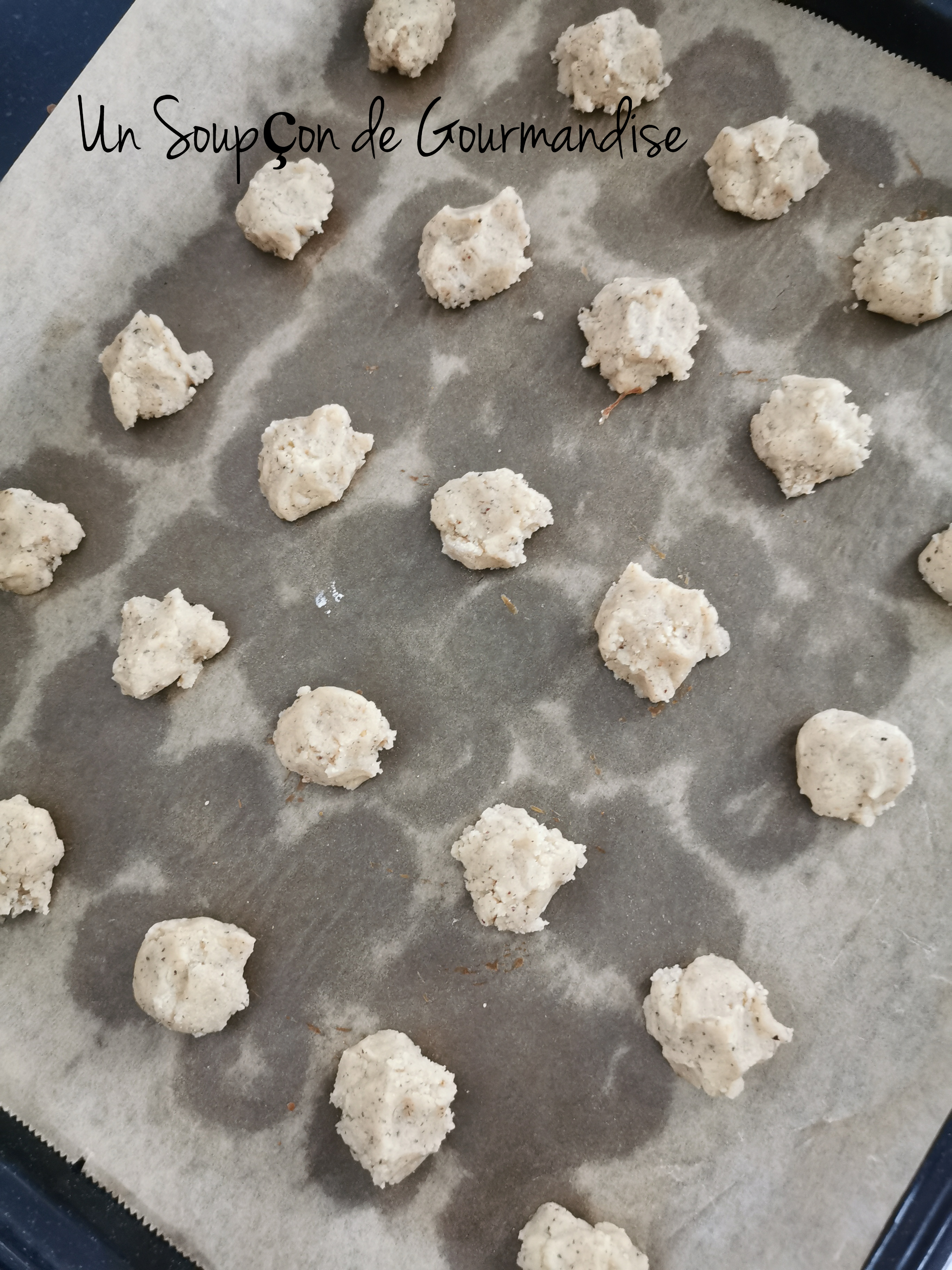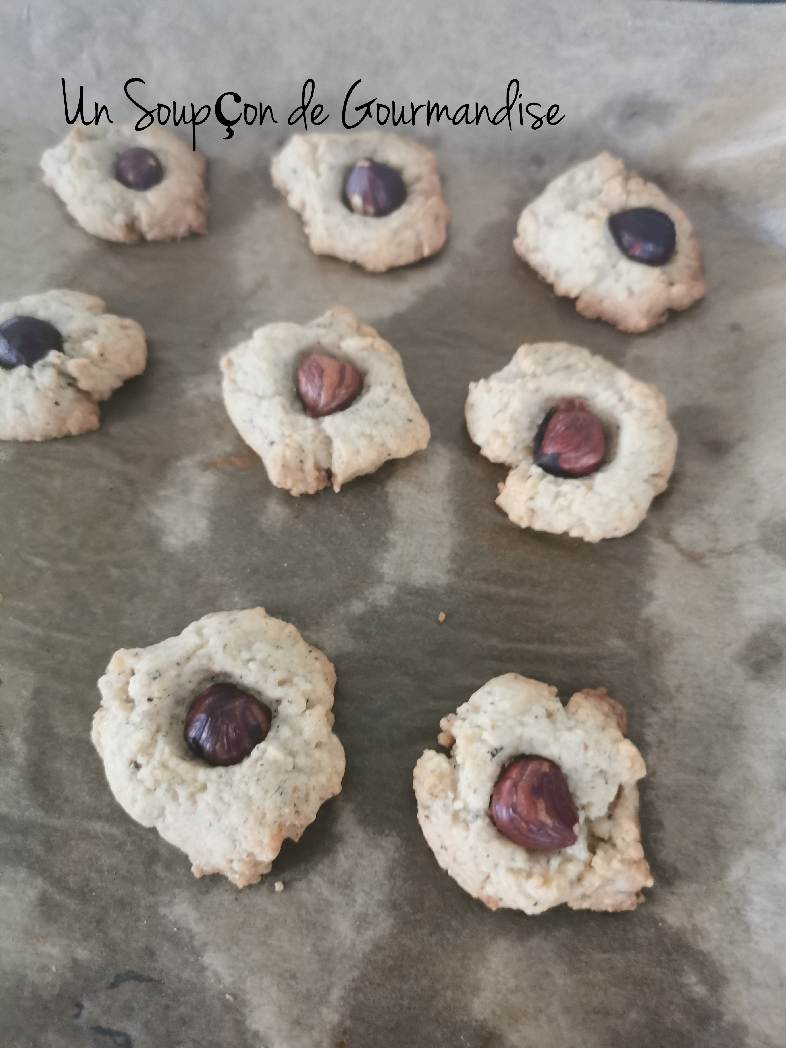 Avec 2 petites cuillères, déposer des petits tas de pâte sur une plaque recouverte de papier sulfurisé. Modeler les petits tas avec le bout des doigts afin d’obtenir des formes arrondies régulières et placer une noisette entière sur chaque biscuit en l’enfonçant bien. On obtient ainsi environ 50 petits gâteaux.