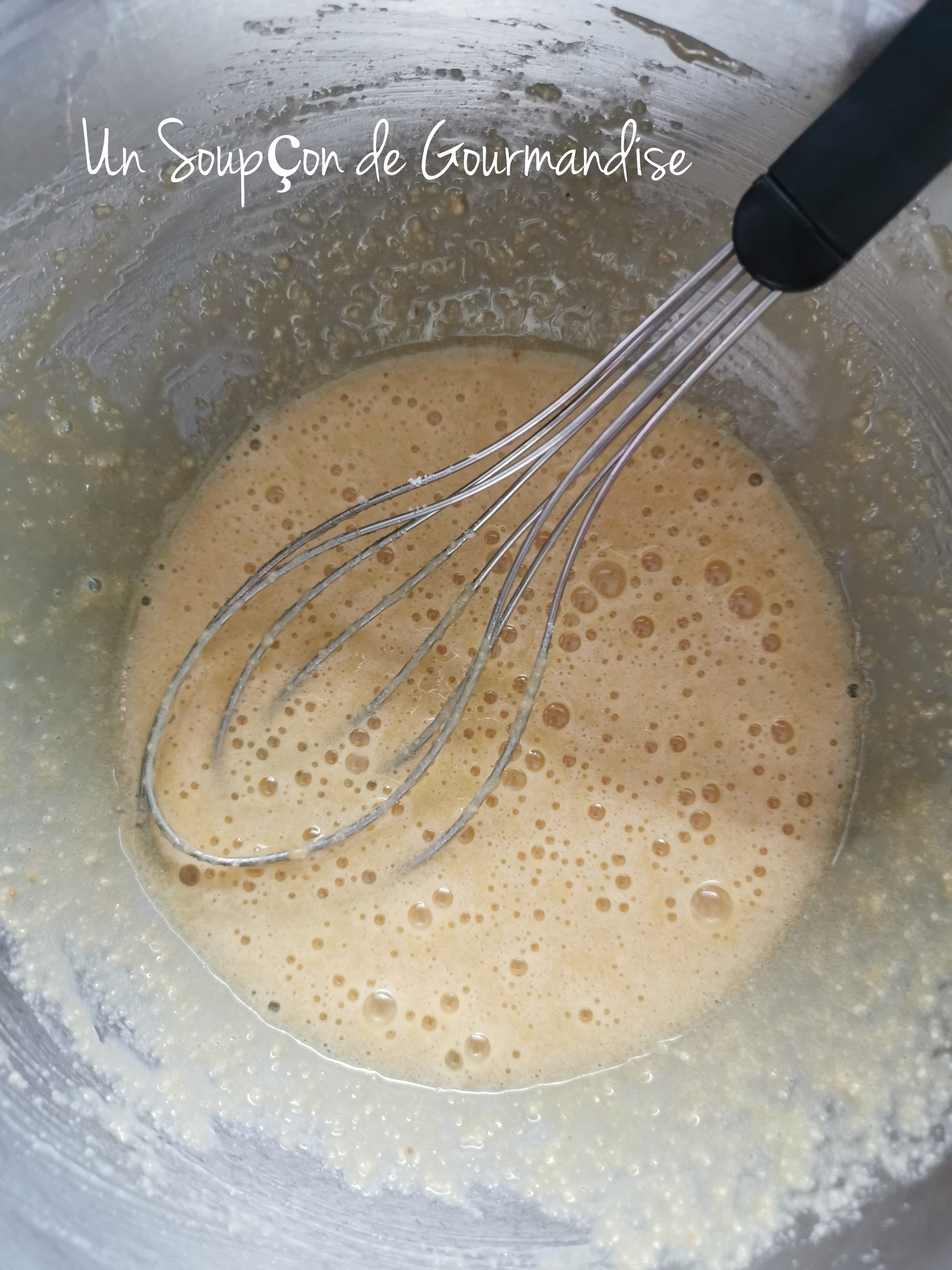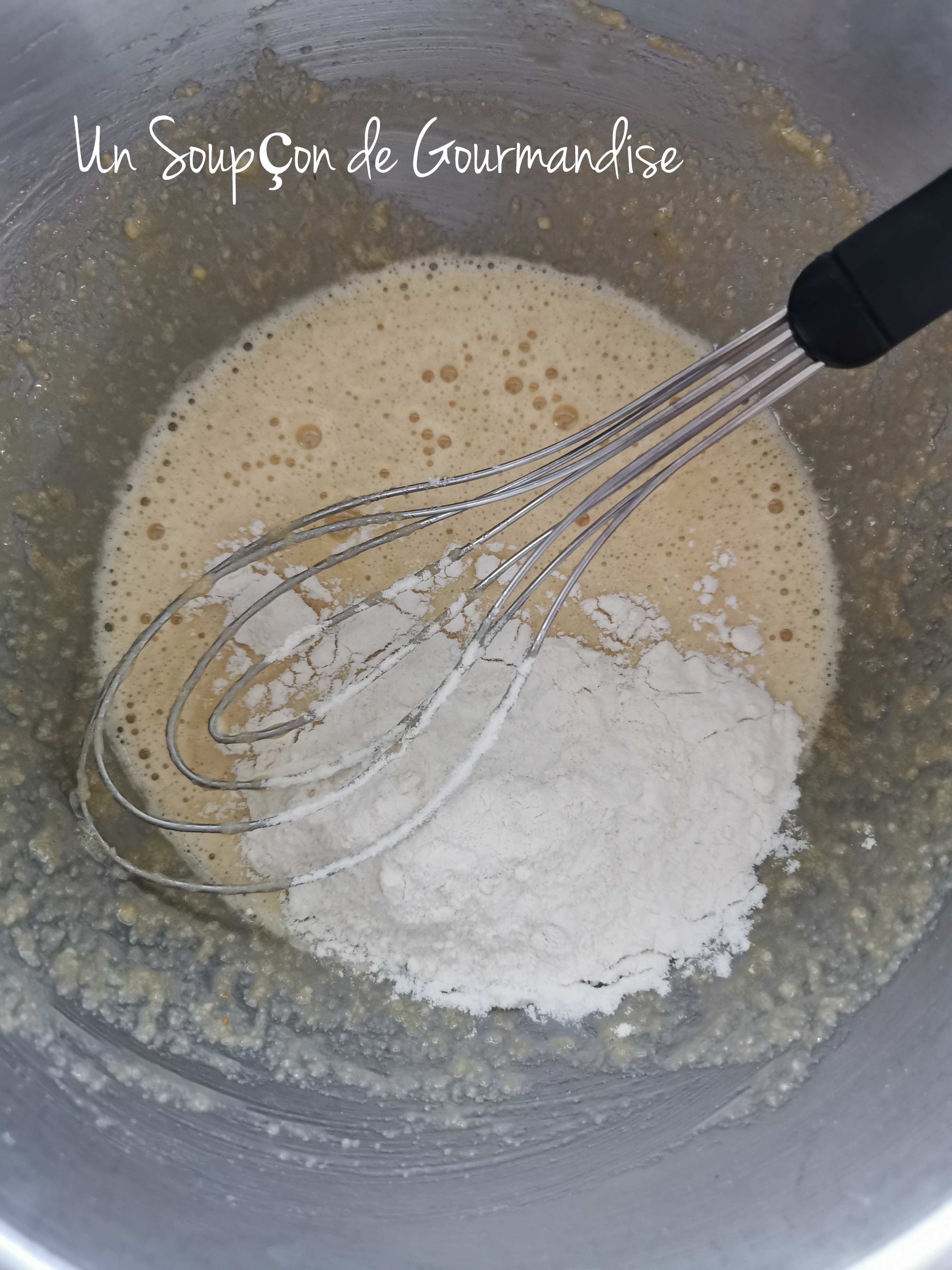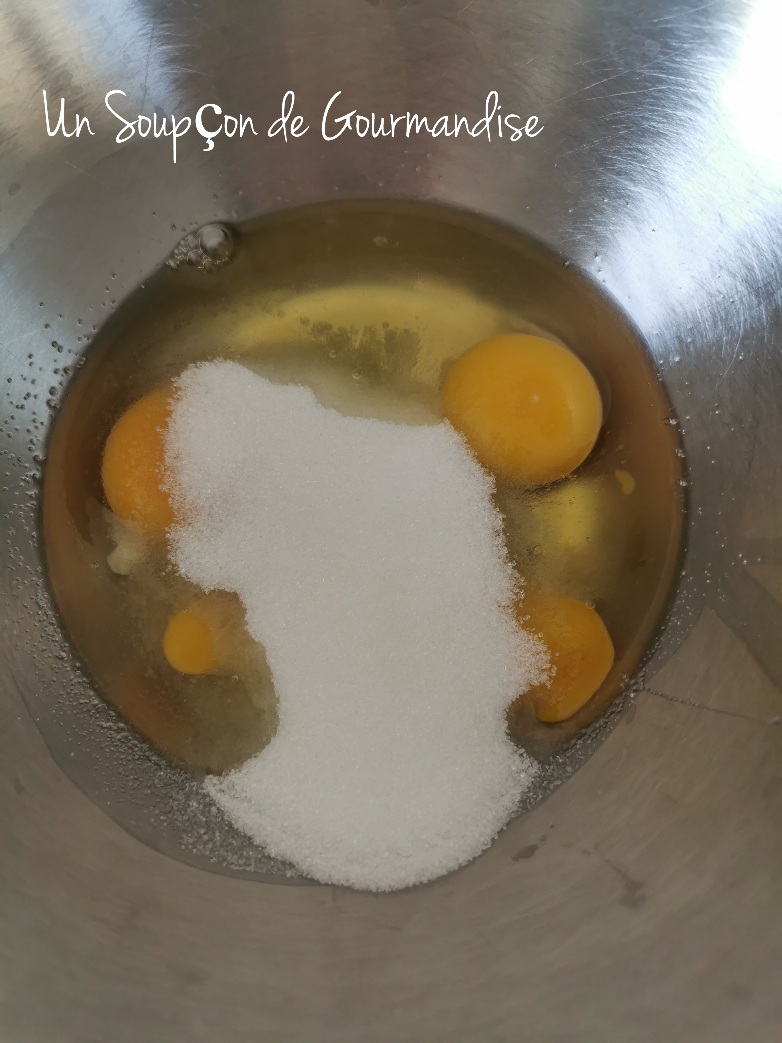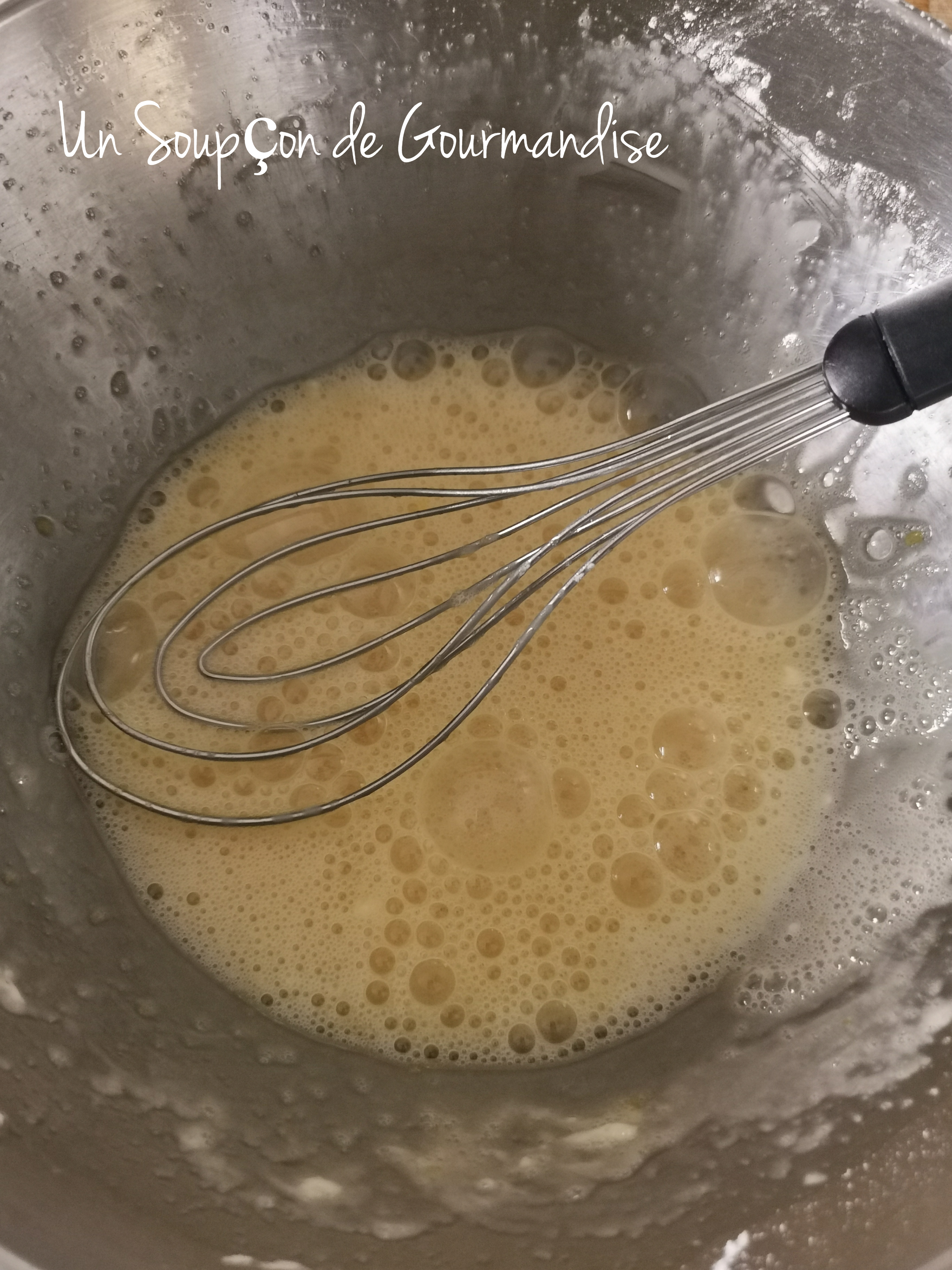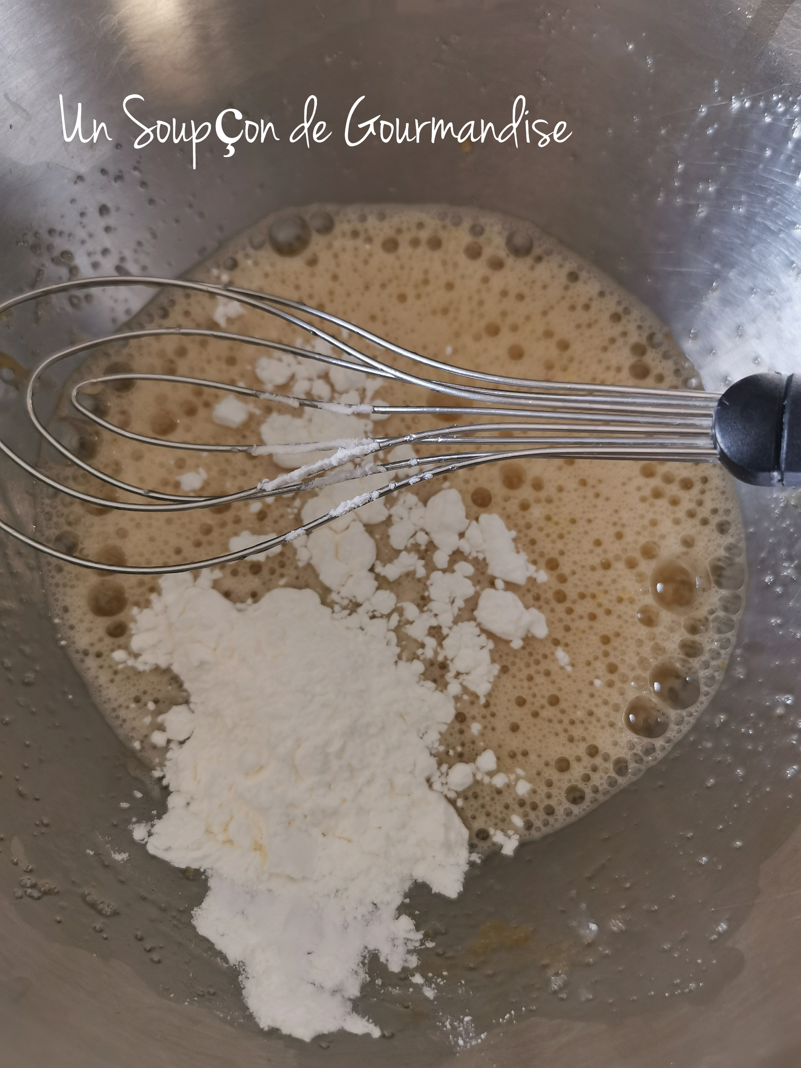 Dans un cul de poule, faire blanchir 3 oeufs avec 70g de cassonade et 15g de Maïzena.