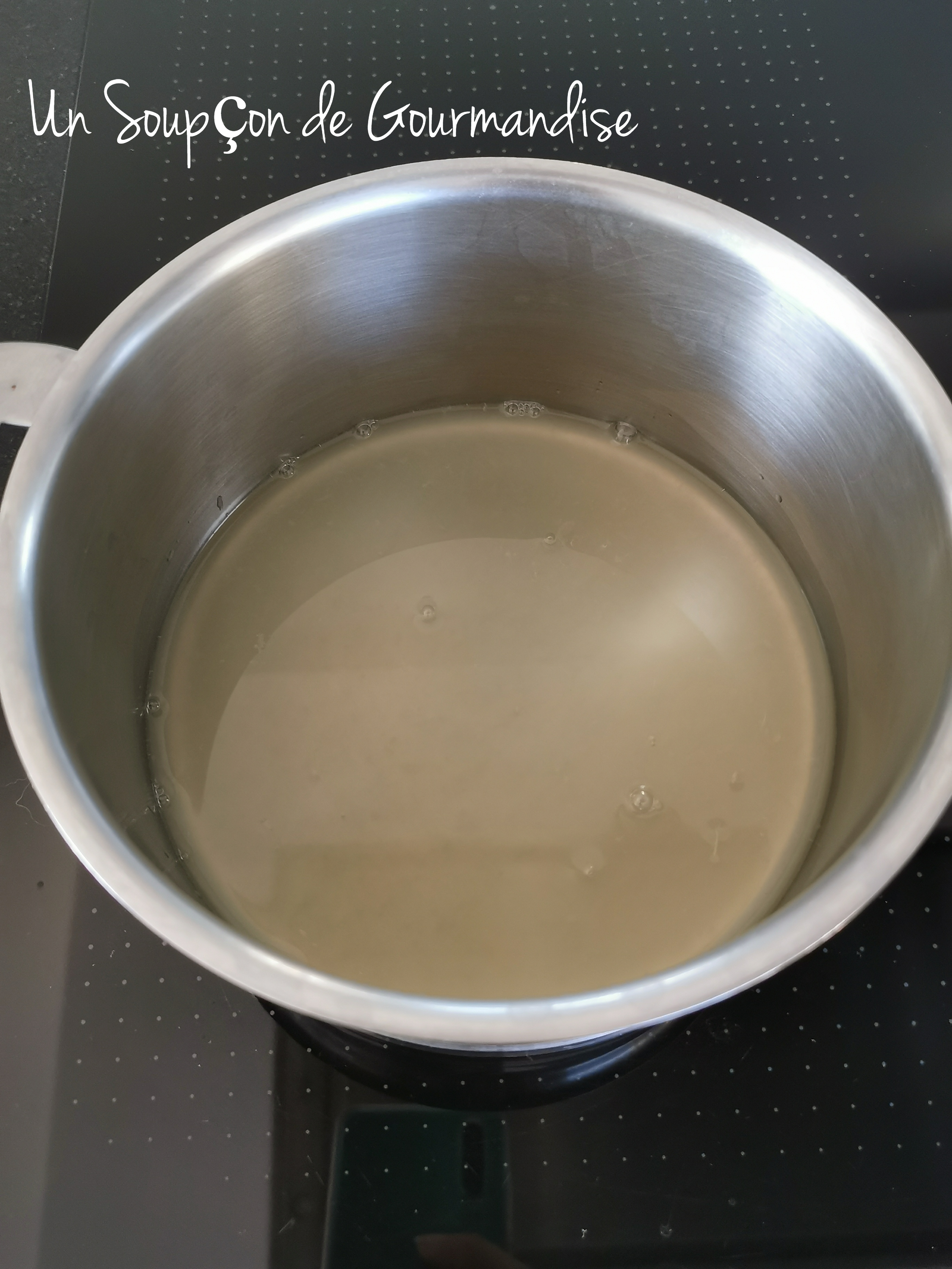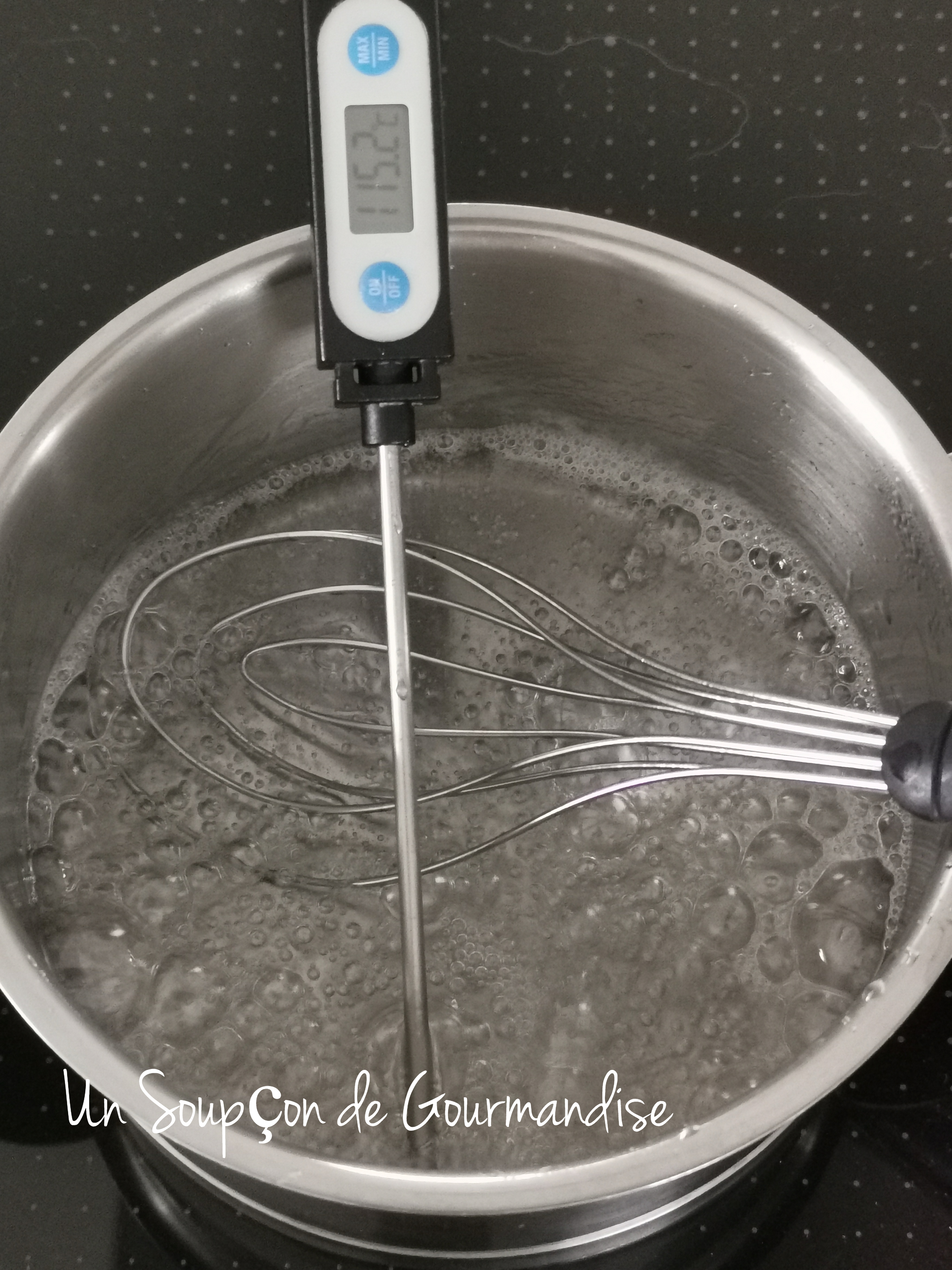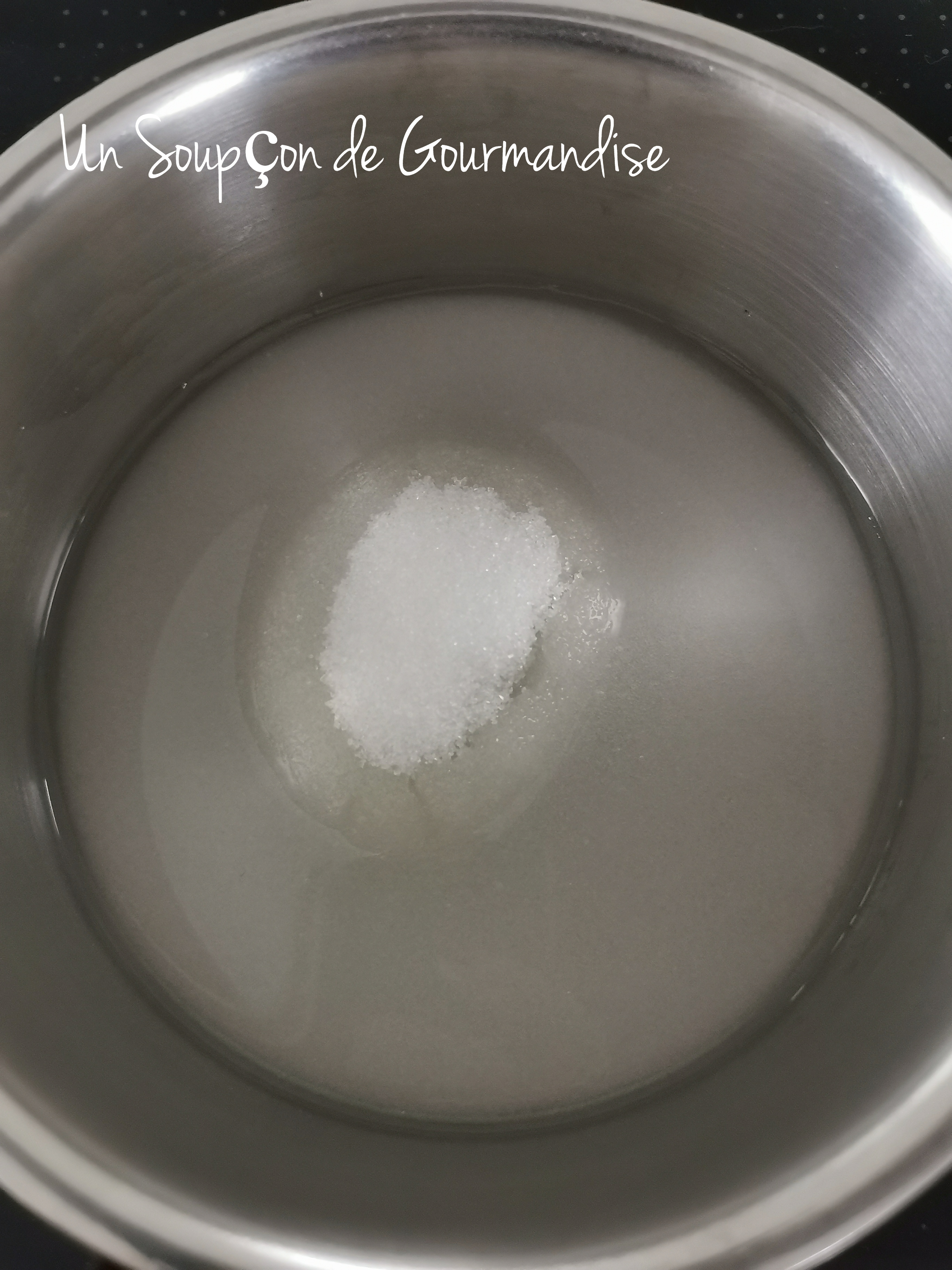 Dans une petite casserole, mettre à chauffer 60g d’eau et 150g de sucre semoule avec un thermomètre culinaire.
