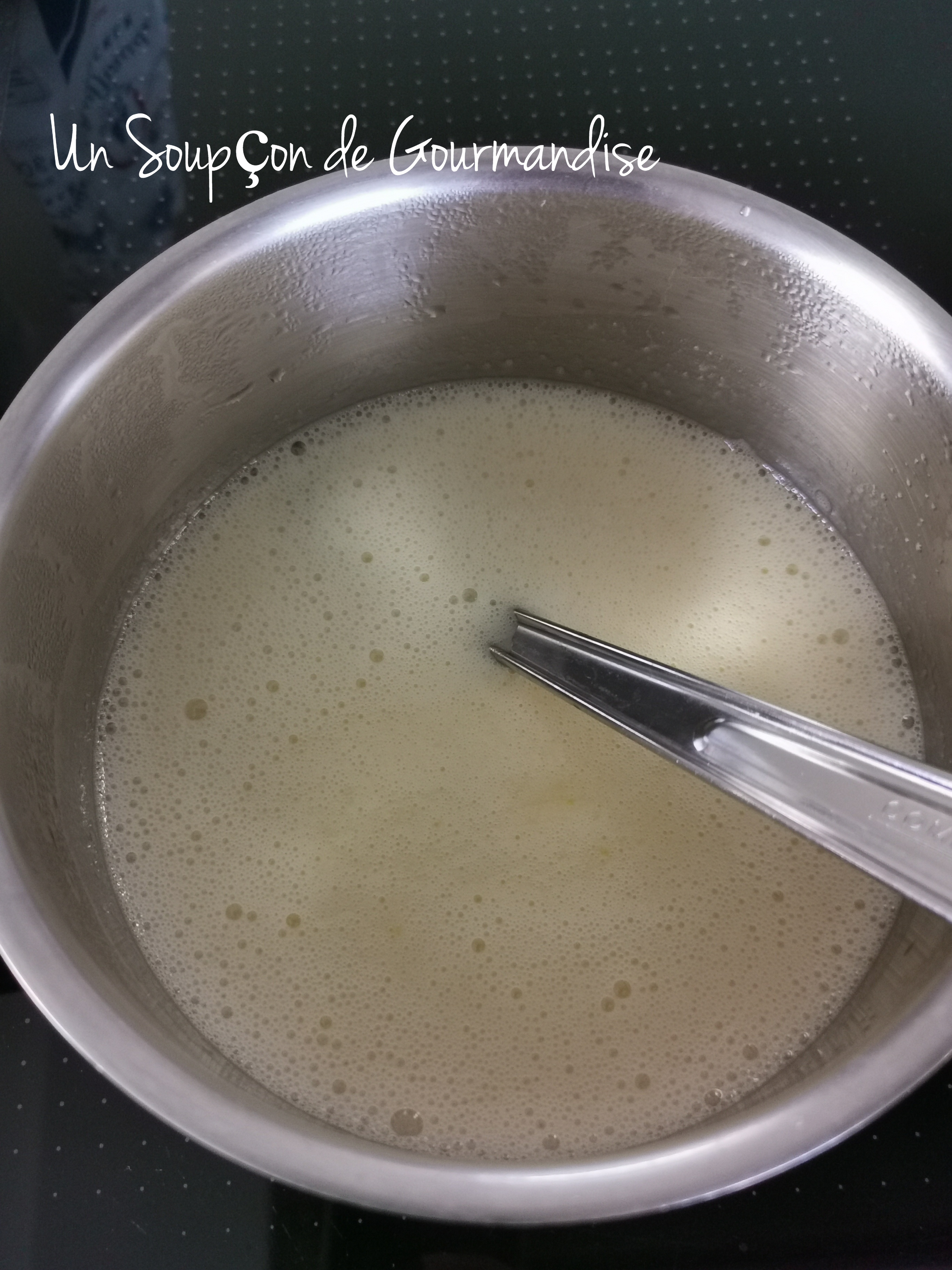 Reverser ce mélange dans la casserole et remettre à chauffer à feu moyen tout en remuant avec une cuillère magique jusqu’à ce que la préparation épaississe (comme une crème pâtissière).