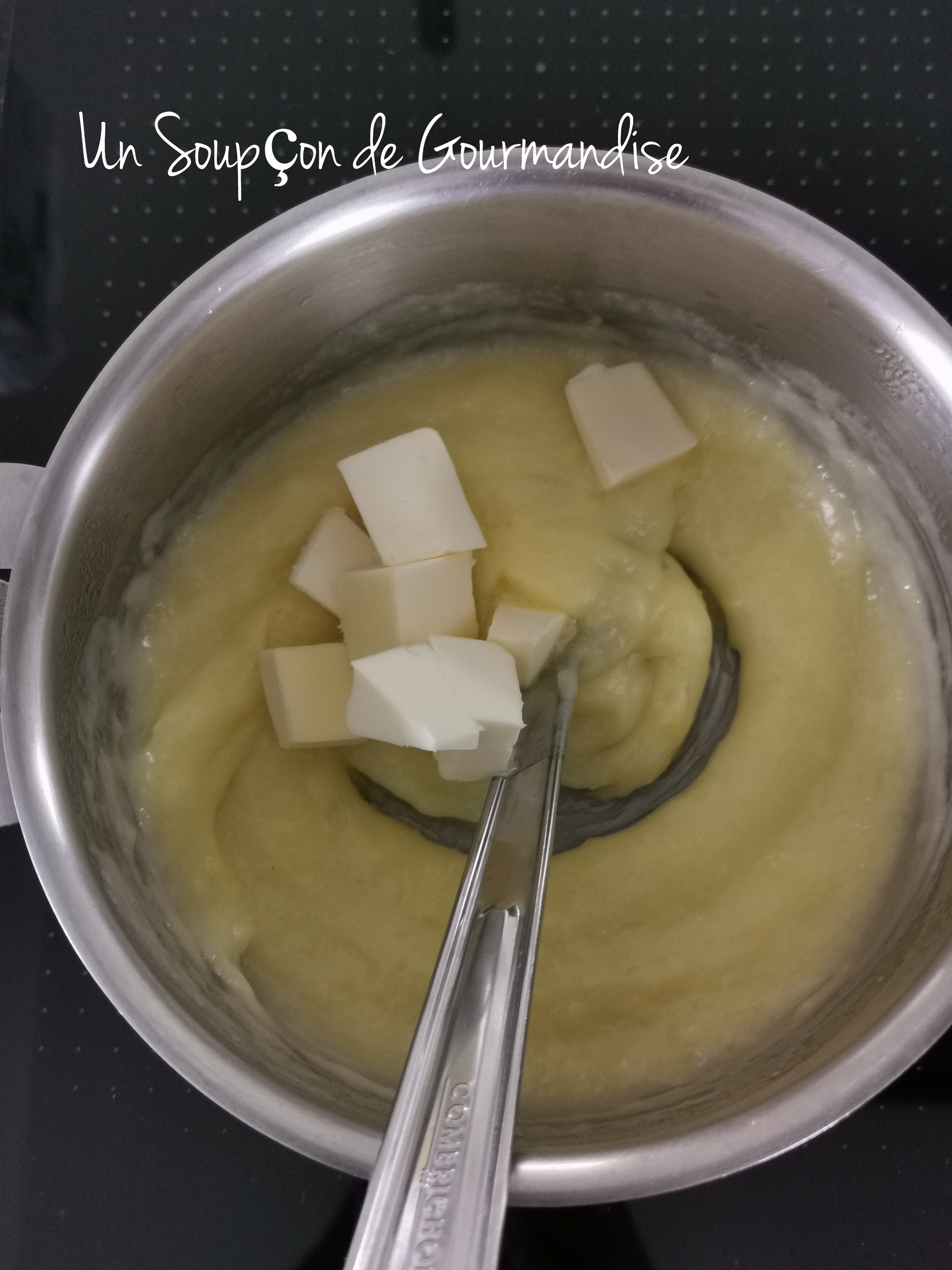 Hors du feu, incorporer la gélatine bien essorée et 35g de beurre froid coupé en petits morceaux. Bien mélanger afin d’obtenir une préparation lisse et homogène.