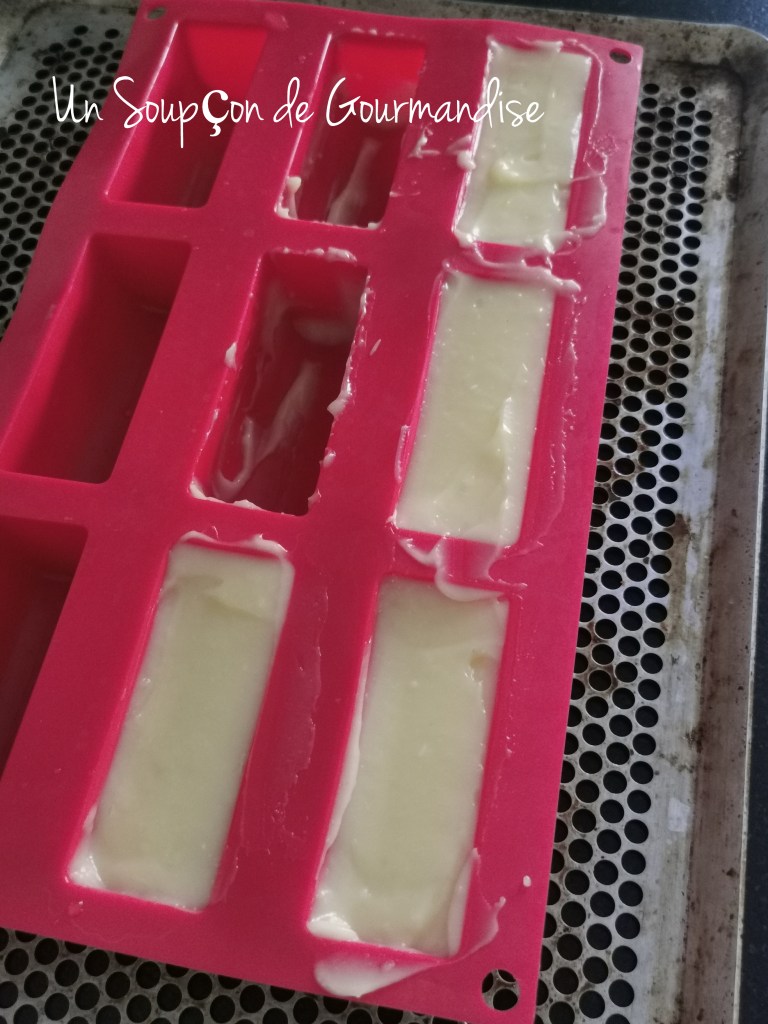 Répartir la préparation dans des empreintes à mini-bûches en silicone en les remplissant aux 2/3 seulement (pas comme moi !) – il faudra 3 inserts dans le montage final de la bûche (les inserts restant pourront rester au congélateur et être utilisés dans une autre recette).