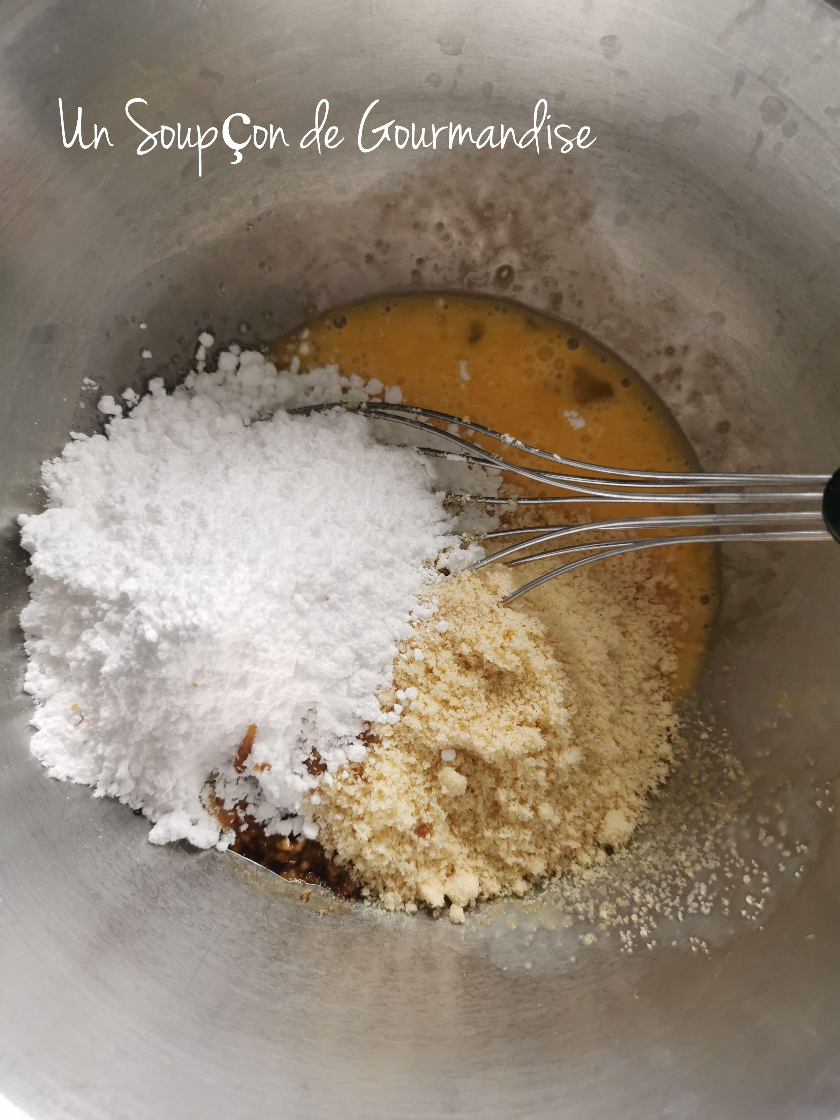 Dans un cul de poule, mélanger 2 oeufs, 1 jaune d’oeuf, 75g de poudre d’amande, 50g de sucre glace et 1/2 cuillère à café d’extrait de vanille puis incorporer 30g de farine T45.