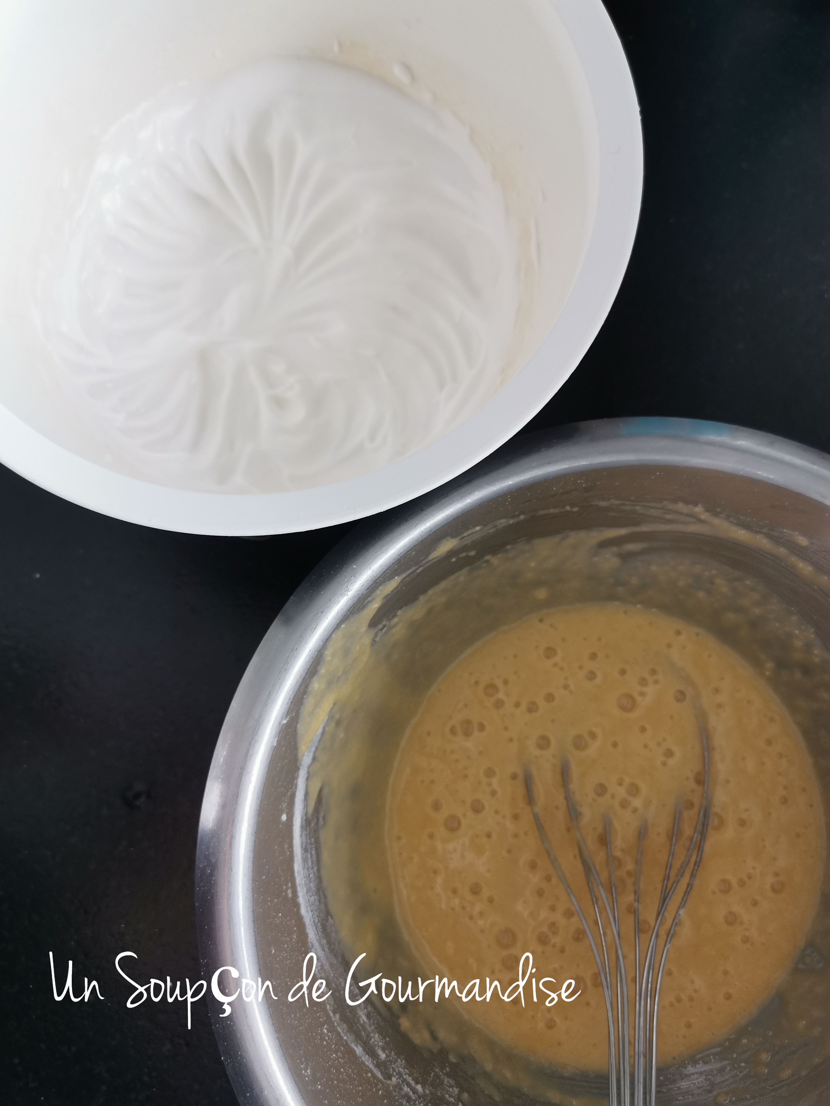 Dans un récipient, battre le blanc d’oeuf restant en neige, y ajouter 20g de sucre glace et battre quelques secondes supplémentaires. Incorporer au mélange précédent délicatement à l’aide d’une spatule.