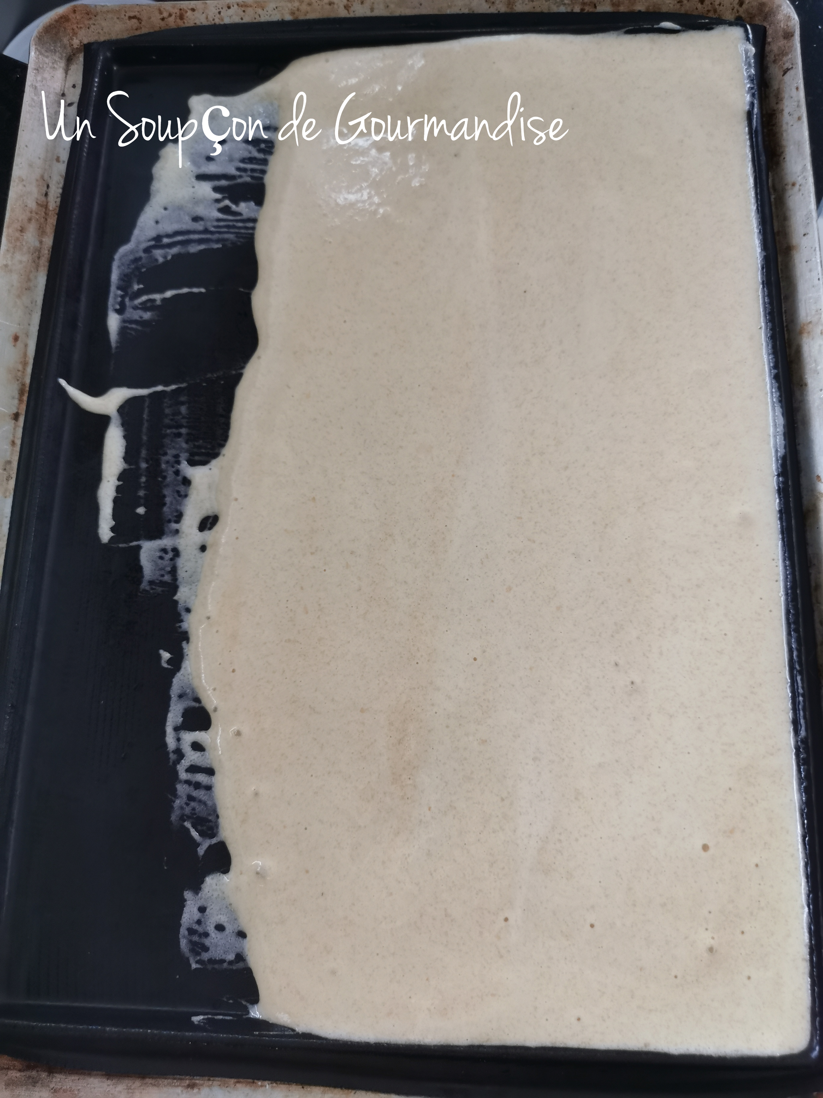 Répartir la préparation obtenue dans un moule plat en silicone préalablement posé sur une plaque perforée ou sur une plaque à pâtisserie recouverte de papier sulfurisé et enfourner pour environ 12 minutes.