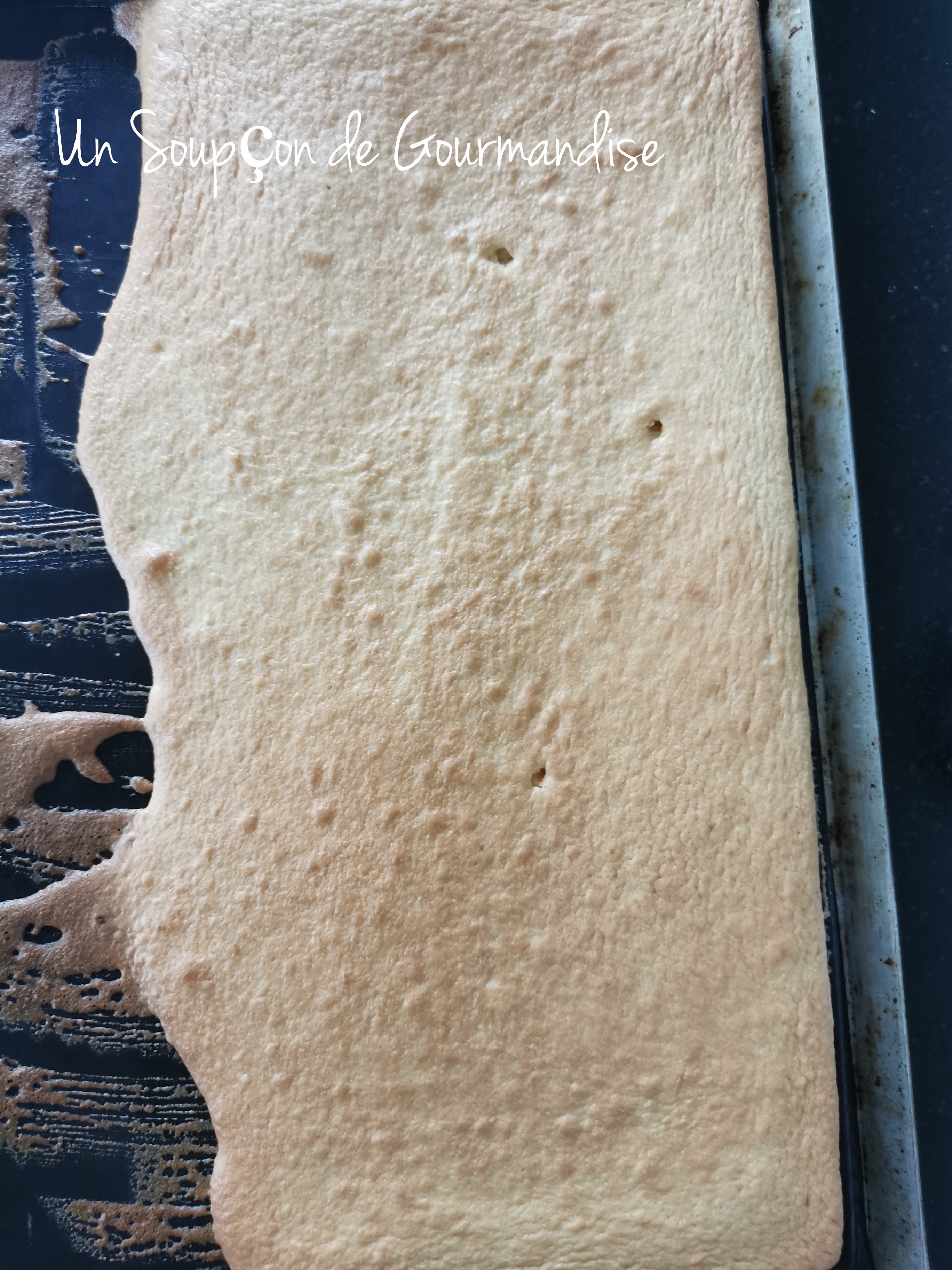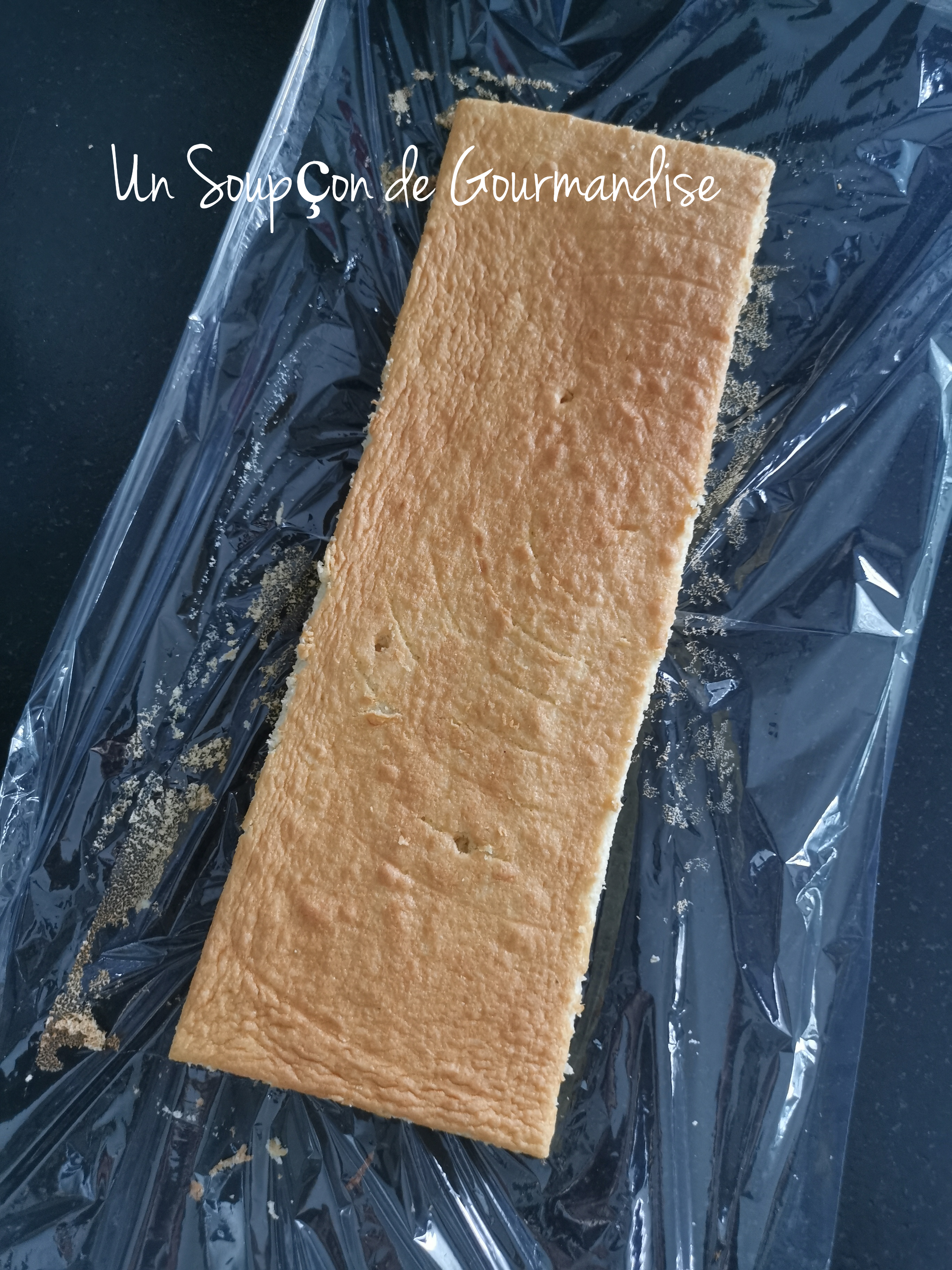 Attendre quelques minutes après la sortie du four puis démouler et laisser refroidir sur une grille. Découper un rectangle de la taille de la gouttière à bûche (30cm x 8cm pour la mienne).
