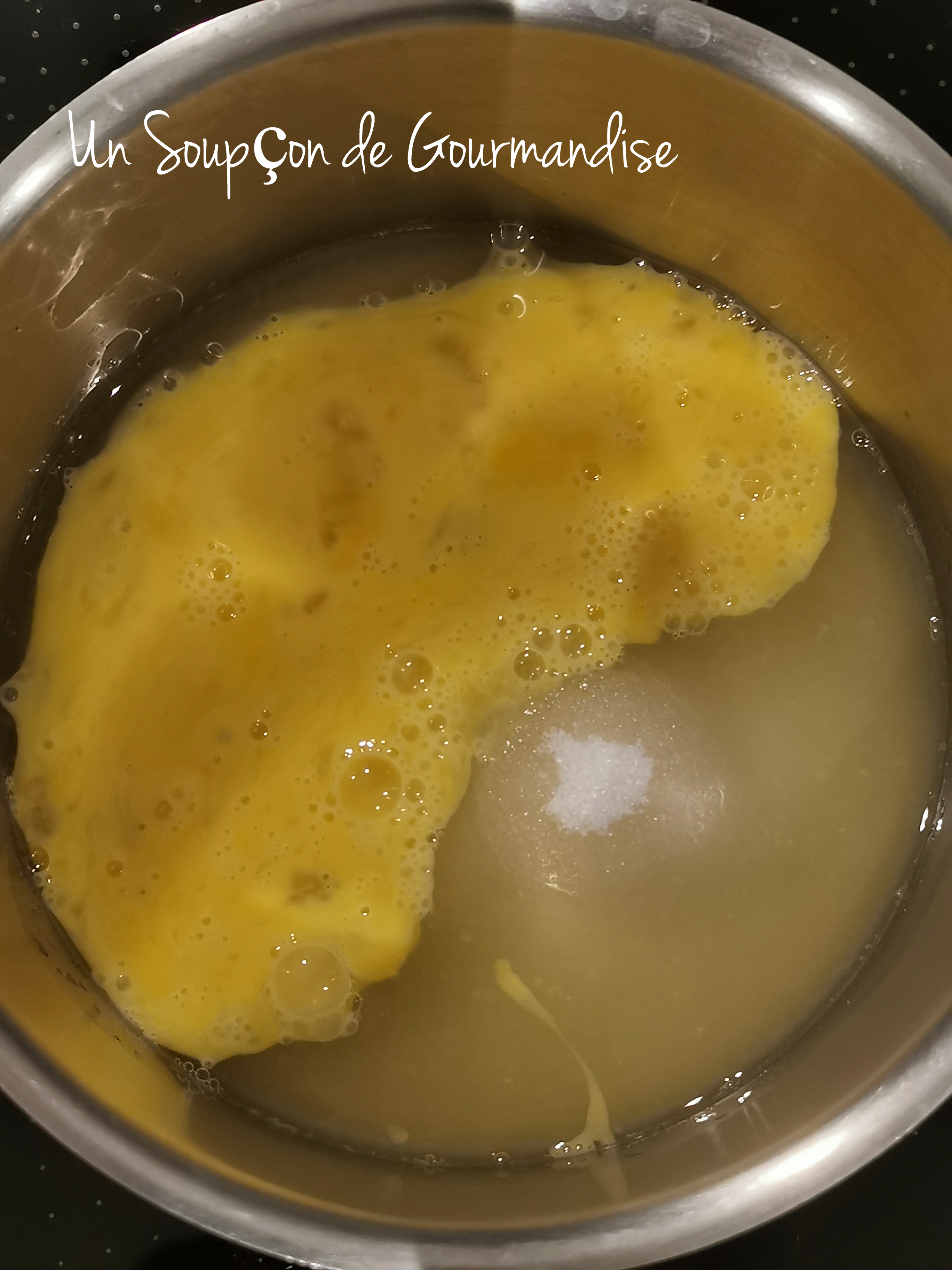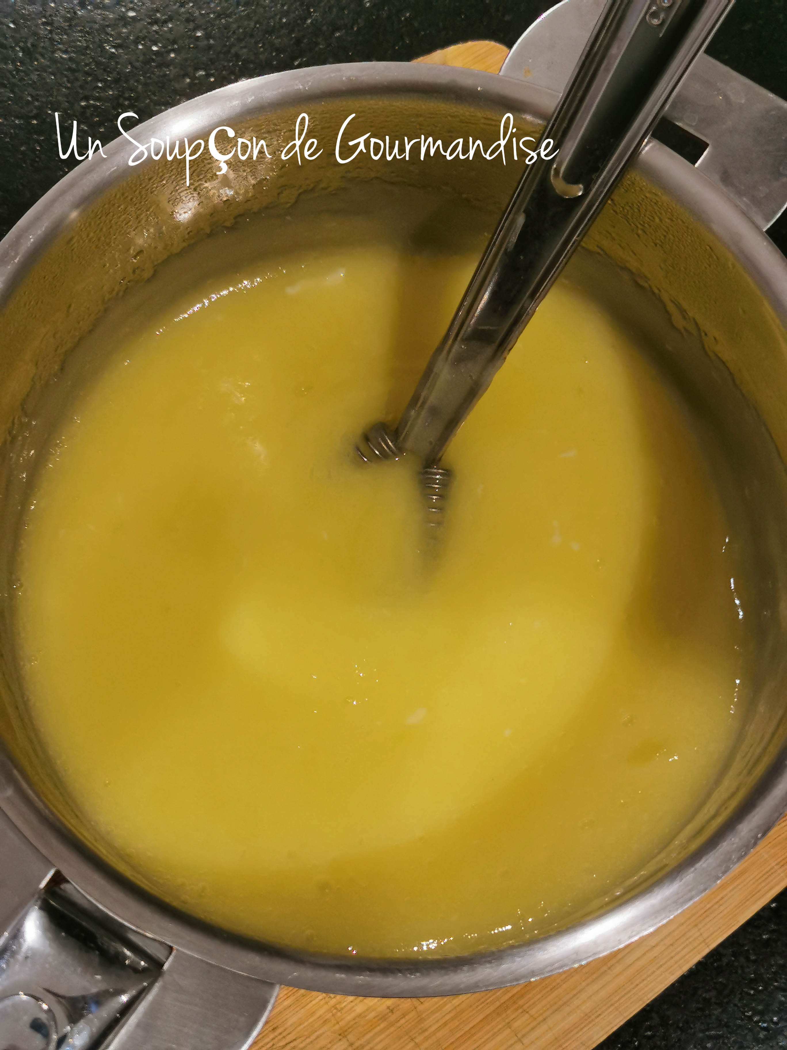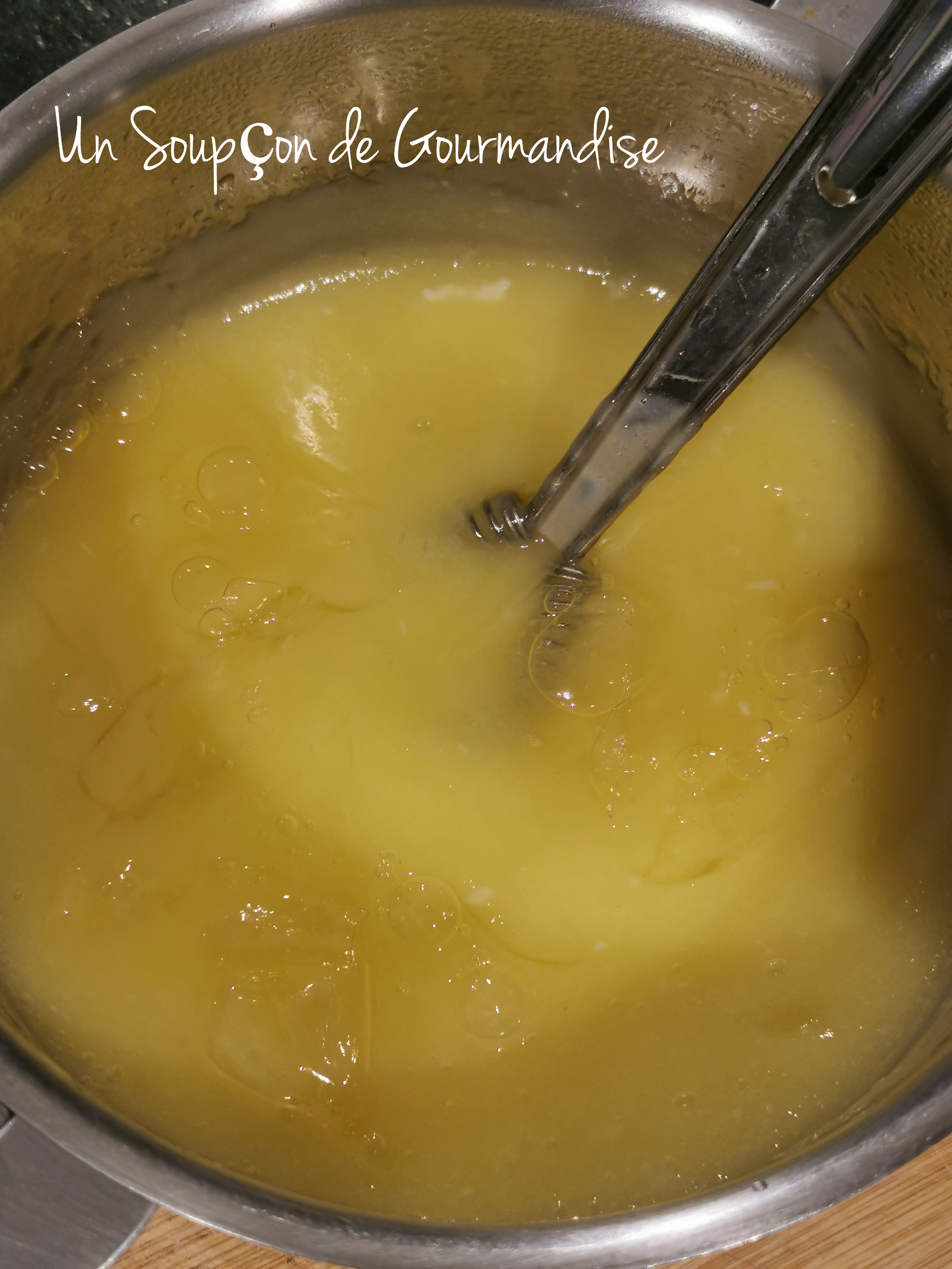 Dans une petite casserole, chauffer 100g de jus de citron jaune avec 90g de sucre semoule et 2 oeufs préalablement battus en omelette. Fouetter avec une cuillère magique jusqu’à ce que le mélange épaississe.