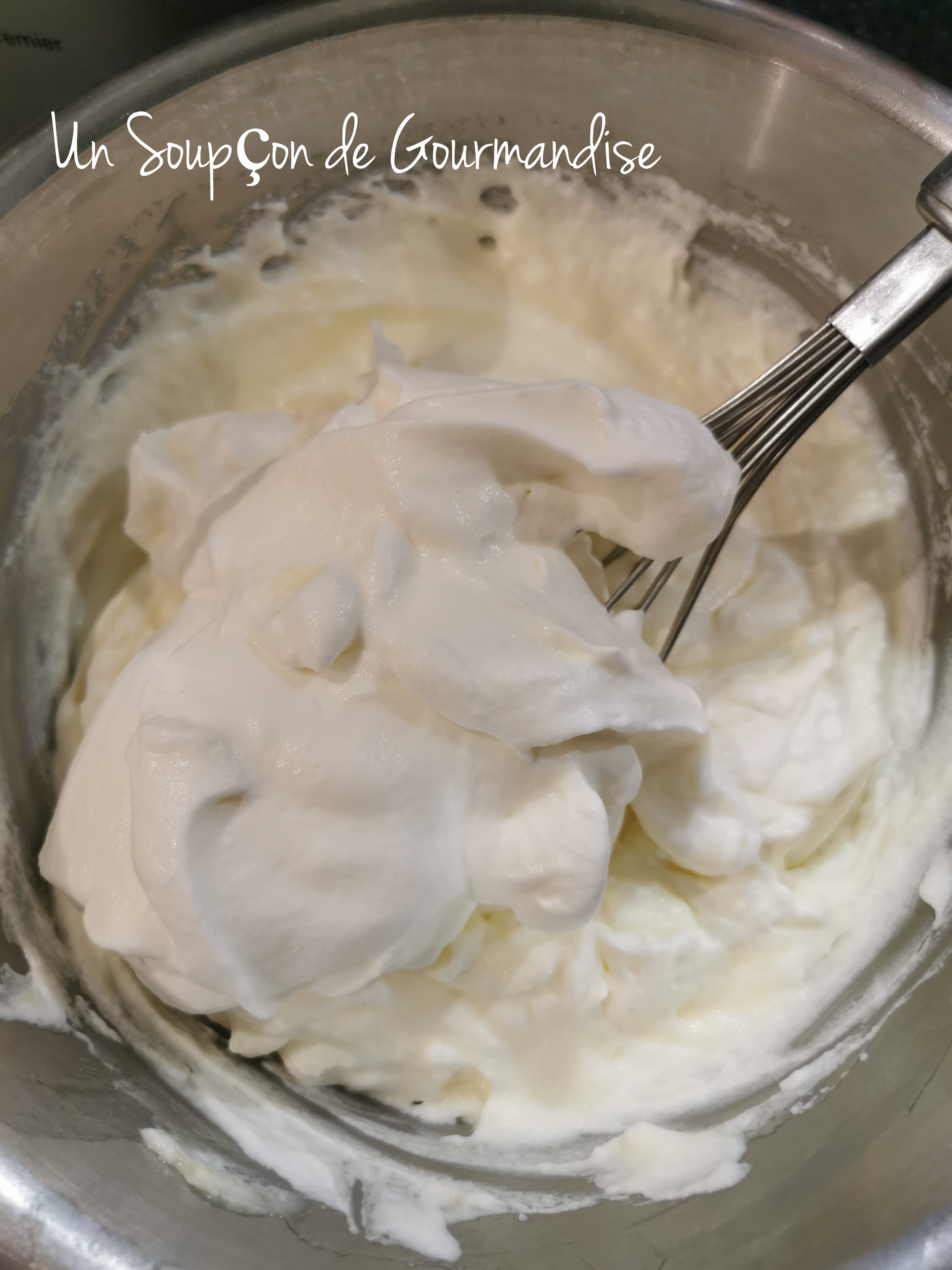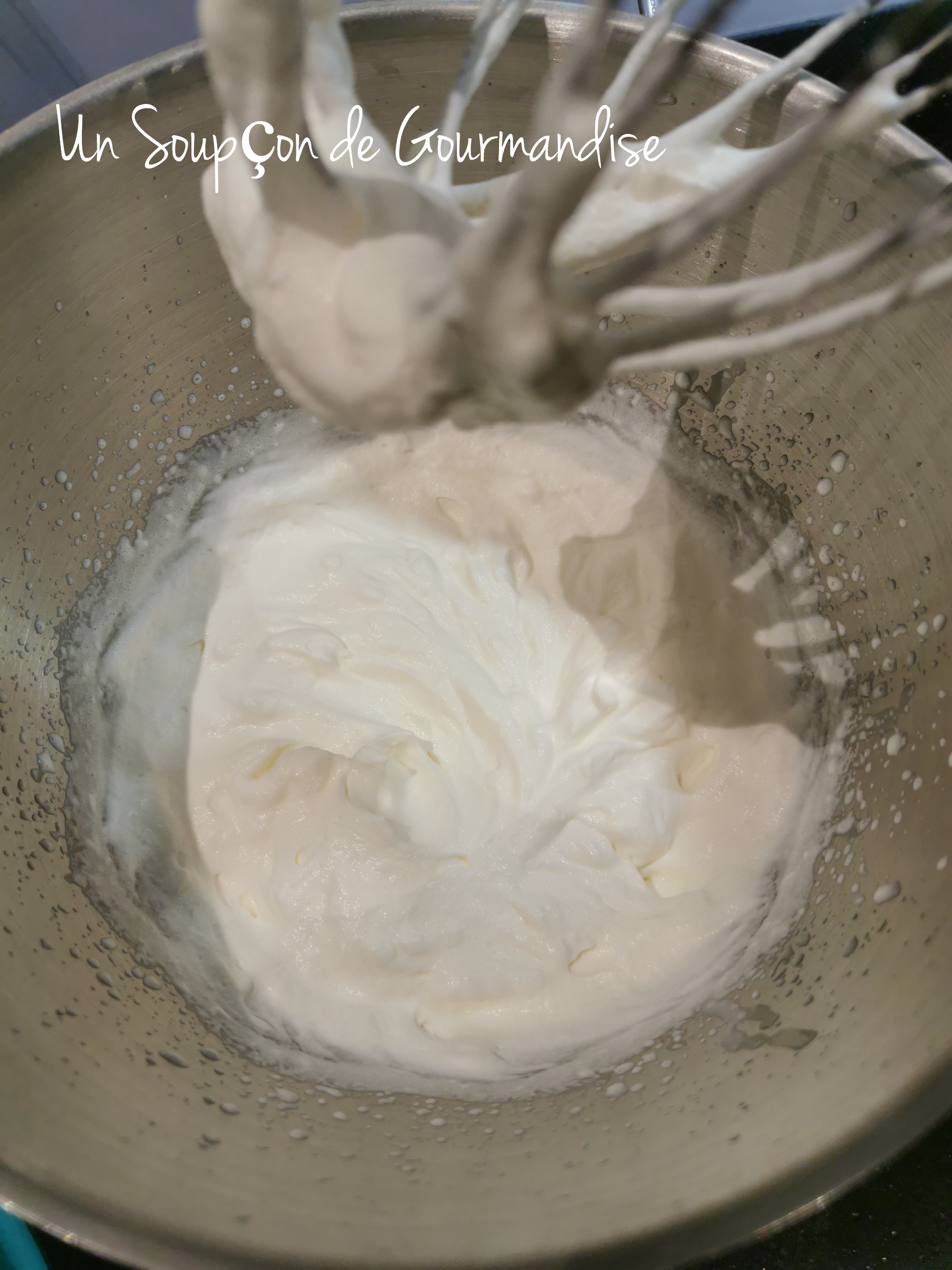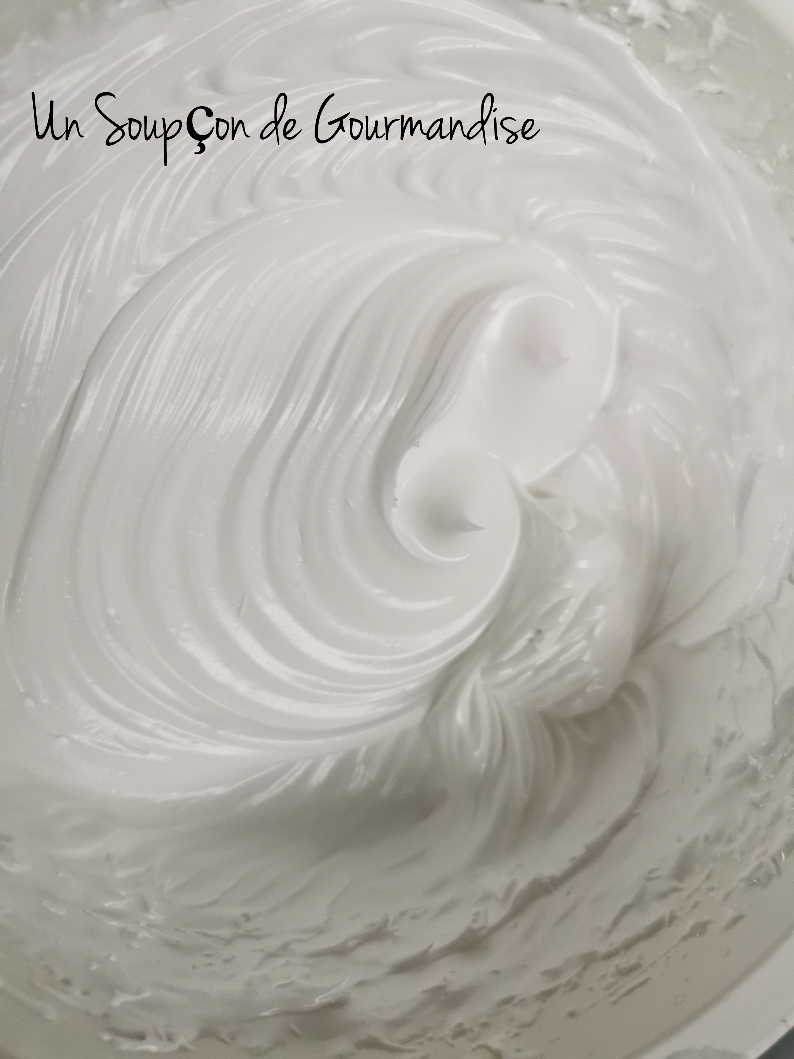 Continuer à battre à vitesse moyenne jusqu’à complet refroidissement de la meringue italienne (environ 10 minutes). Elle doit alors être bien brillante et faire cui-cui le bec d’oiseau. ^^