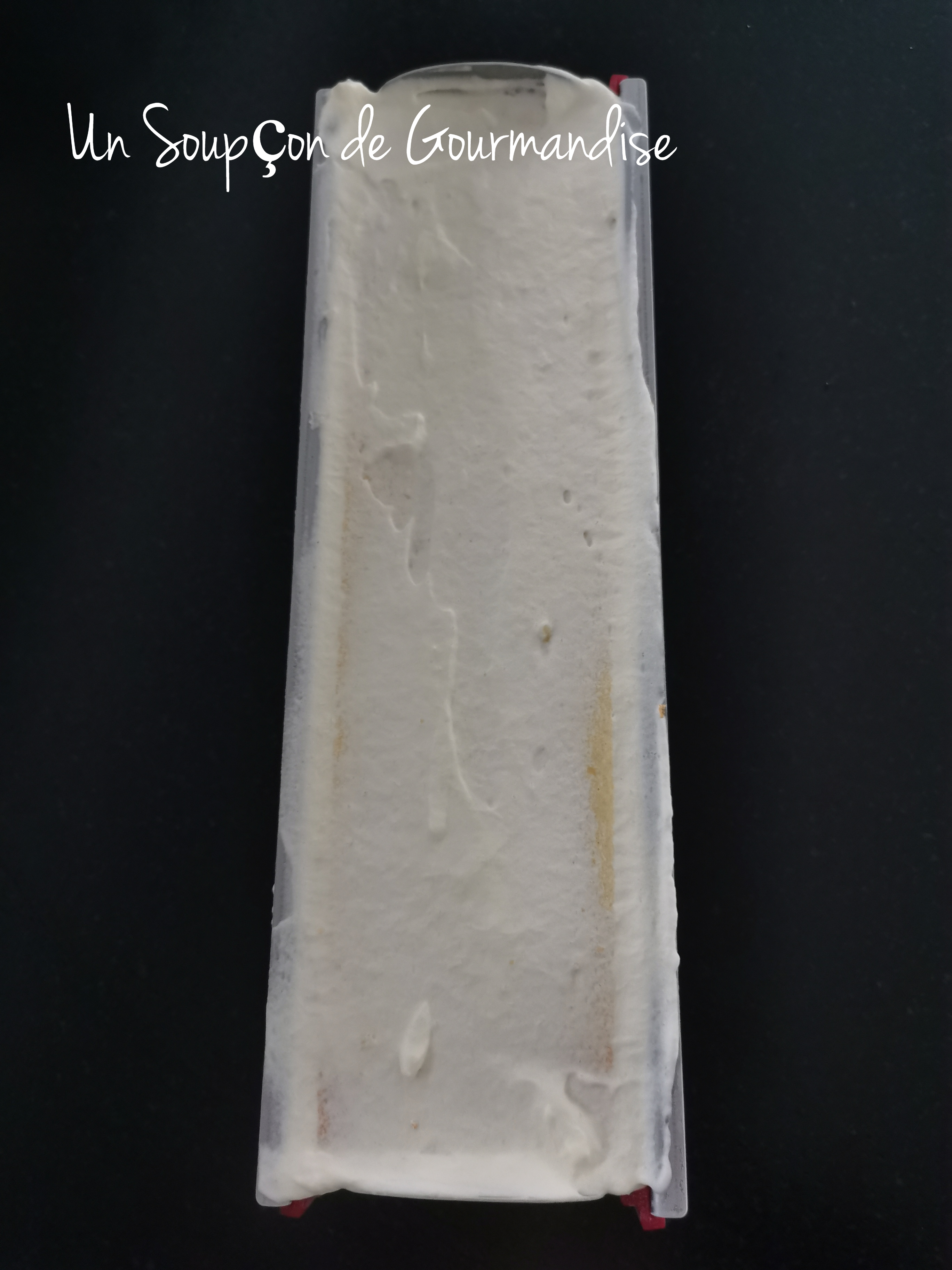 Découper un rectangle légèrement plus petit que la taille du moule à bûche et placer au congélateur au moins 2 heures (ou jusqu’au lendemain).