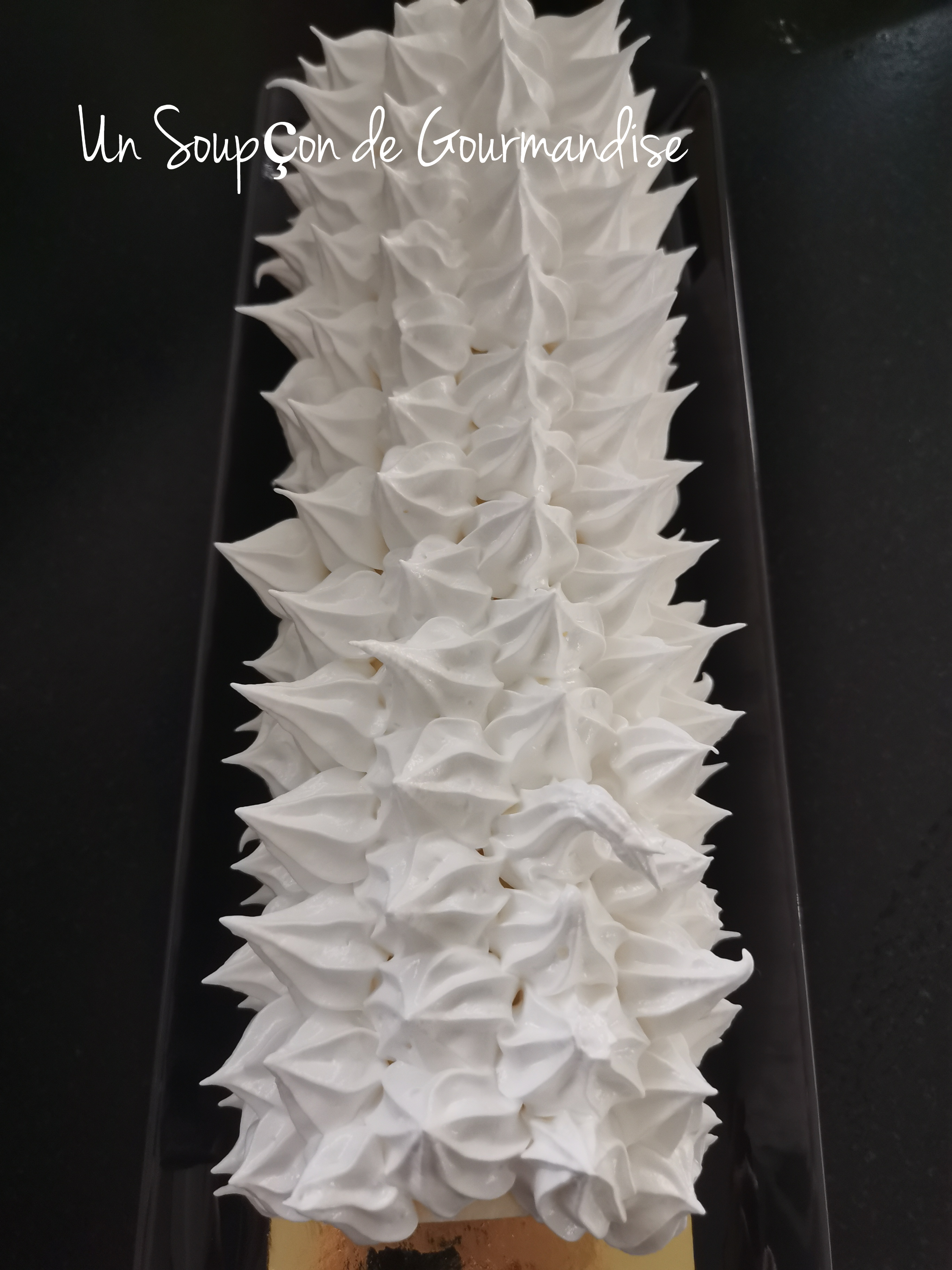 Mettre dans une poche munie d’une douille cannelée, pocher la meringue italienne sur la bûche et la colorer à l’aide d’un chalumeau.