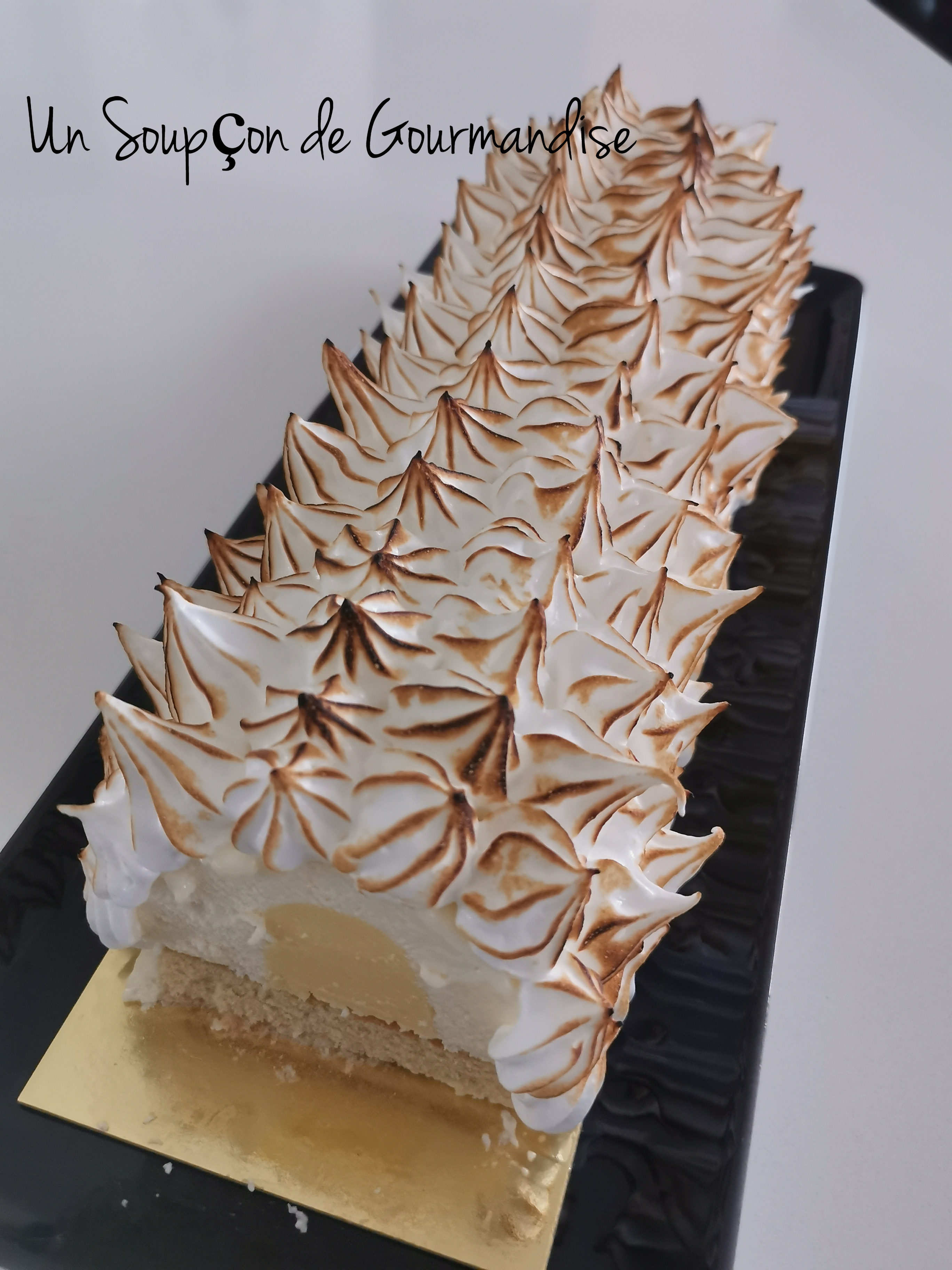 Cette bûche se compose d’un biscuit joconde, d’un croustillant au chocolat blanc, d’un insert crémeux au citron, d’une mousse au citron et d’une meringue italienne.