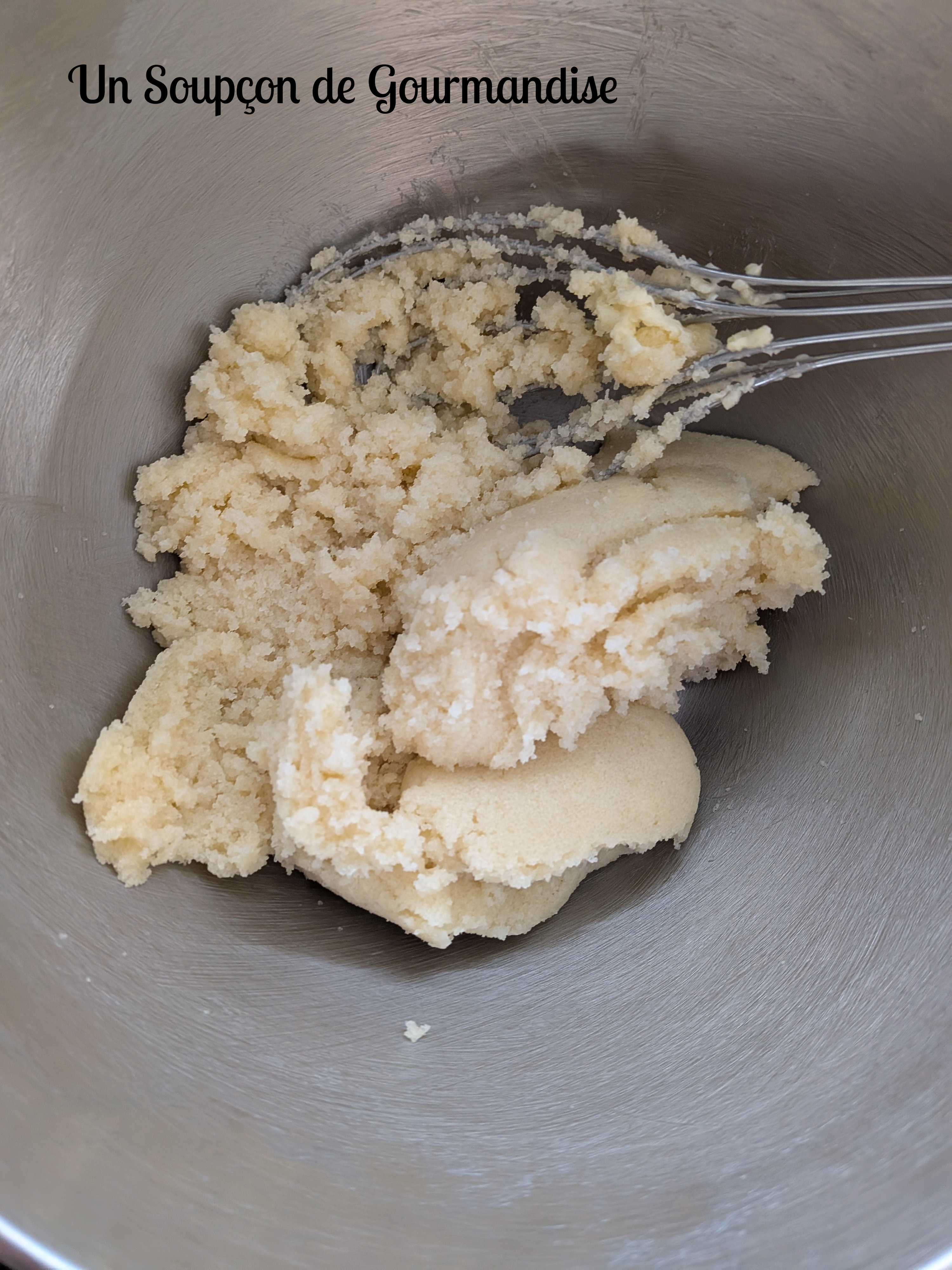 Dans un cul de poule, battre 100g de beurre mou avec 100g de sucre semoule et 60g de sucre roux jusqu’à obtention d’une texture crémeuse.