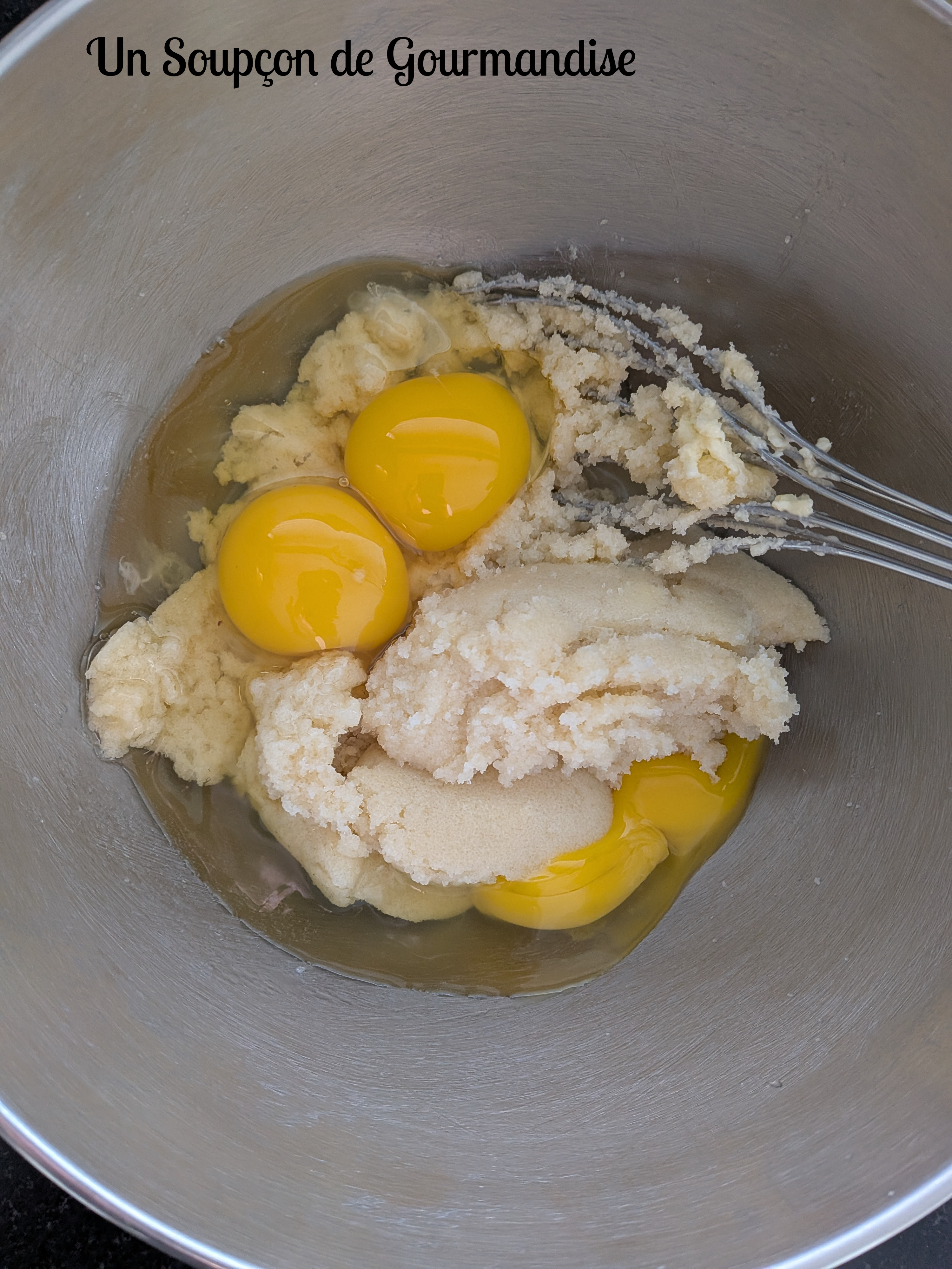 Incorporer 3 oeufs et mélanger jusqu’à ce que la prépration soit homogène.