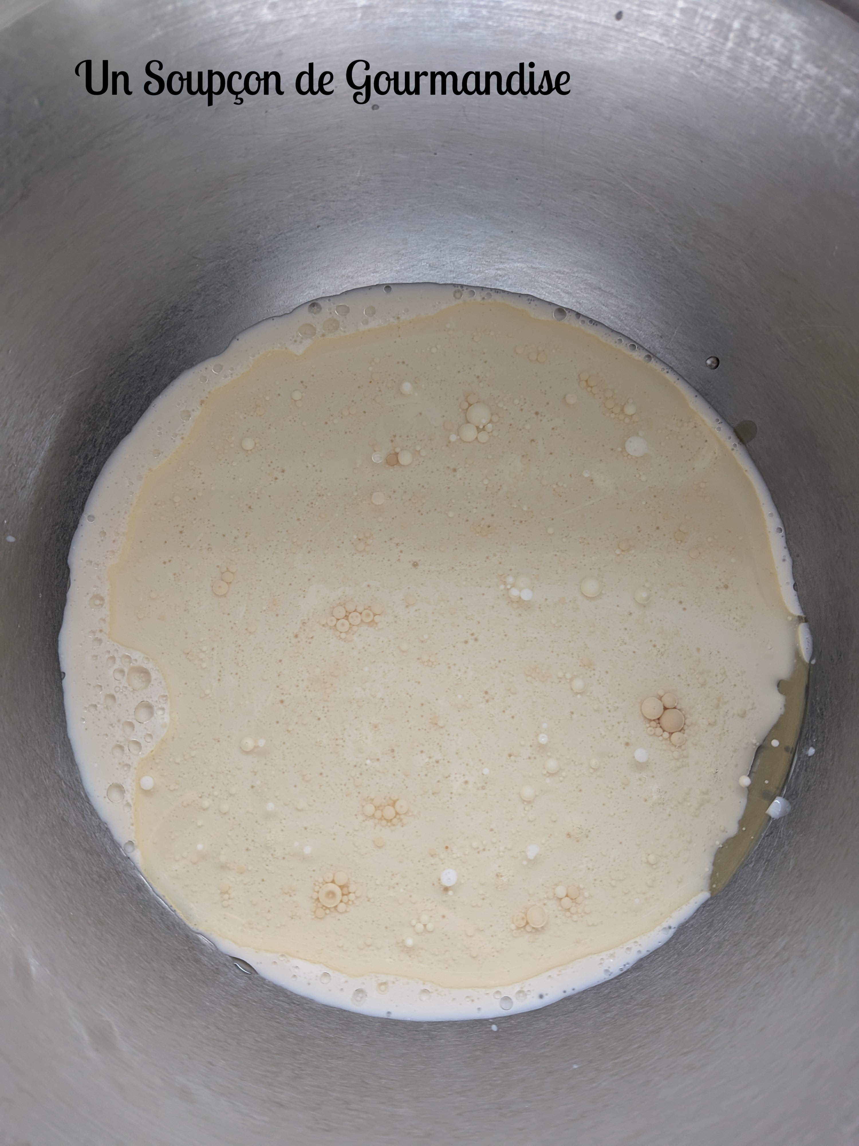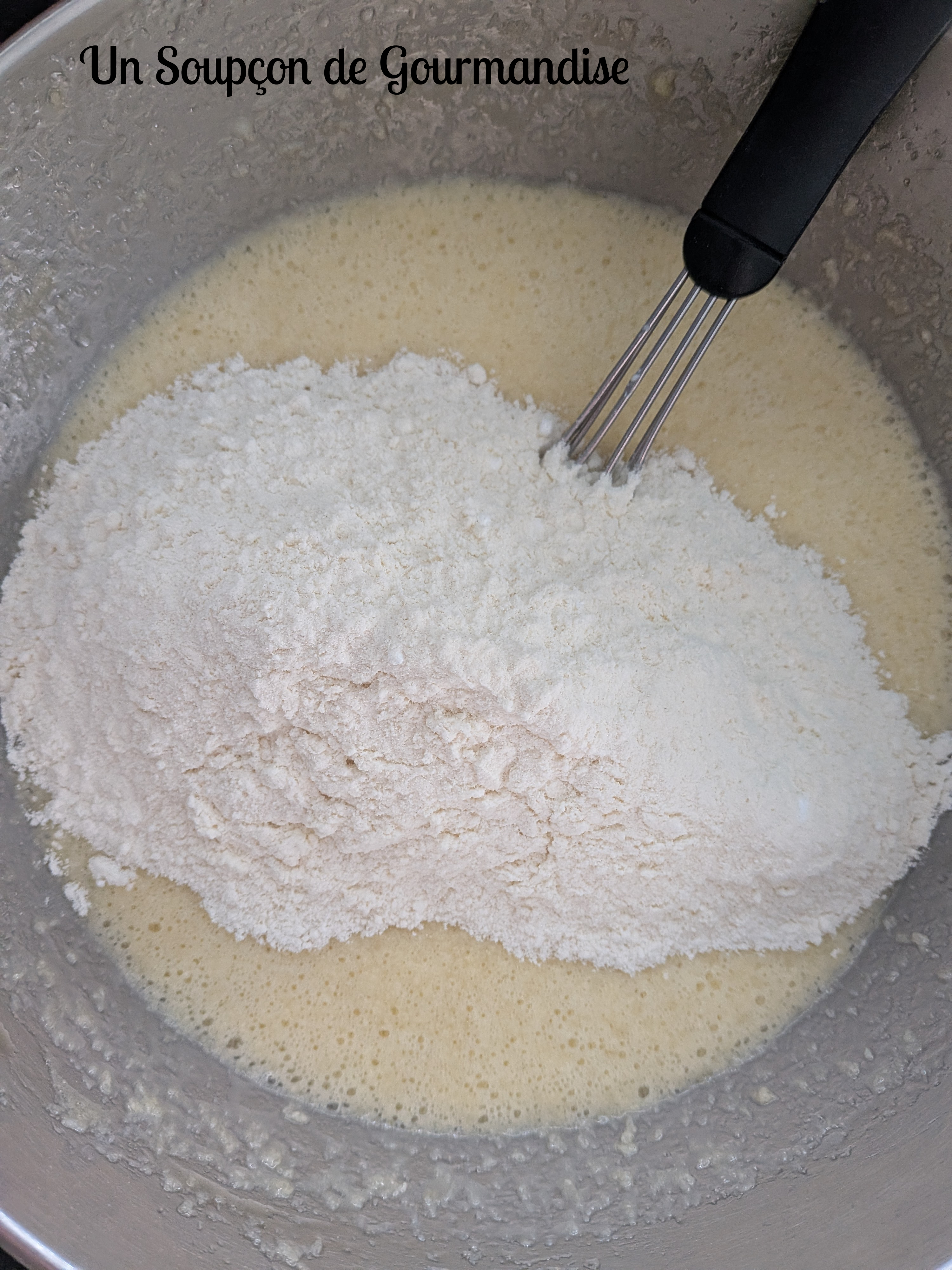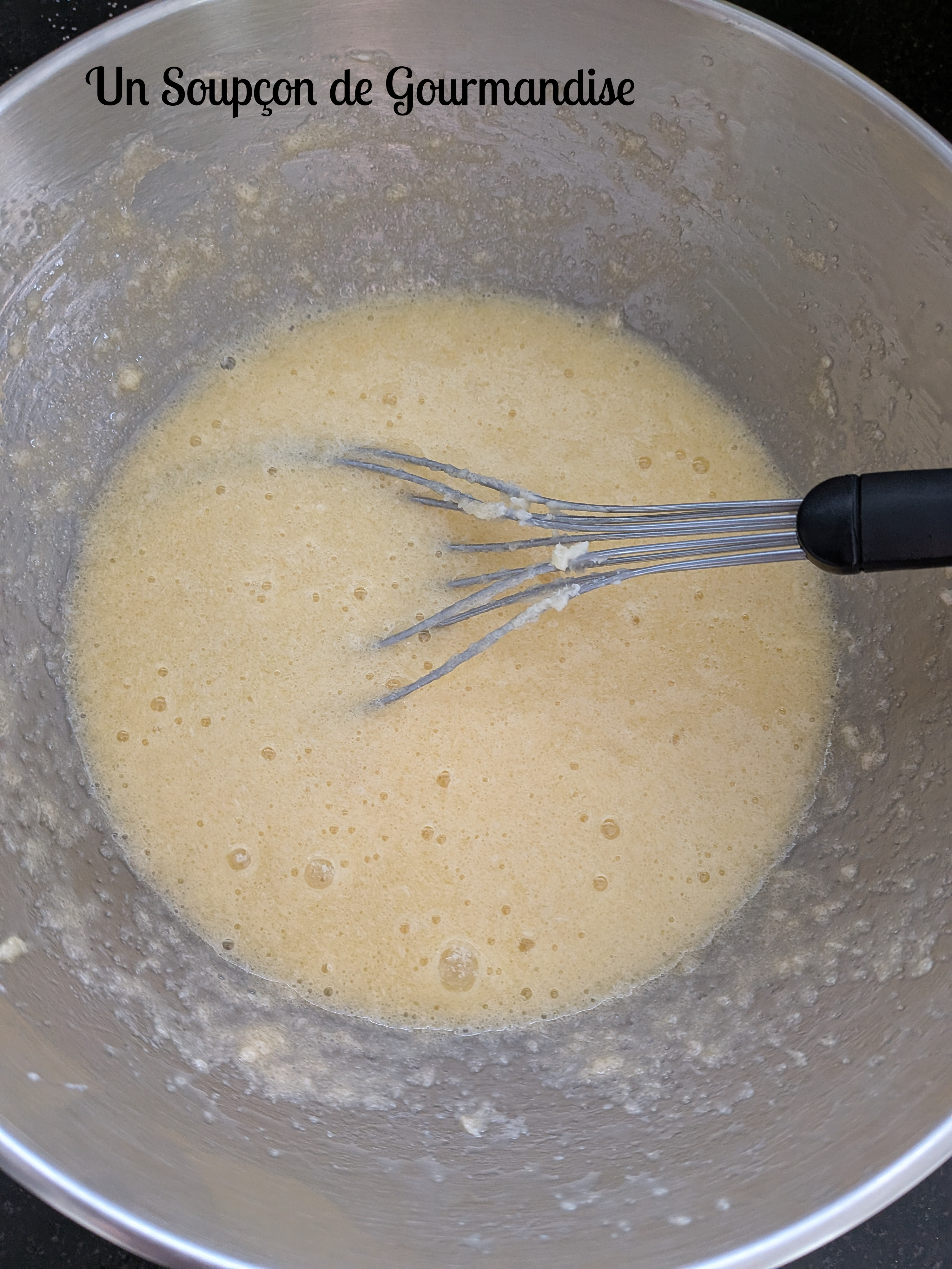 Incorporer enfin le reste des ingrédients liquides puis le reste des ingrédients secs et foutter énergiquement afin d’obtenir une pâte bien lisse.