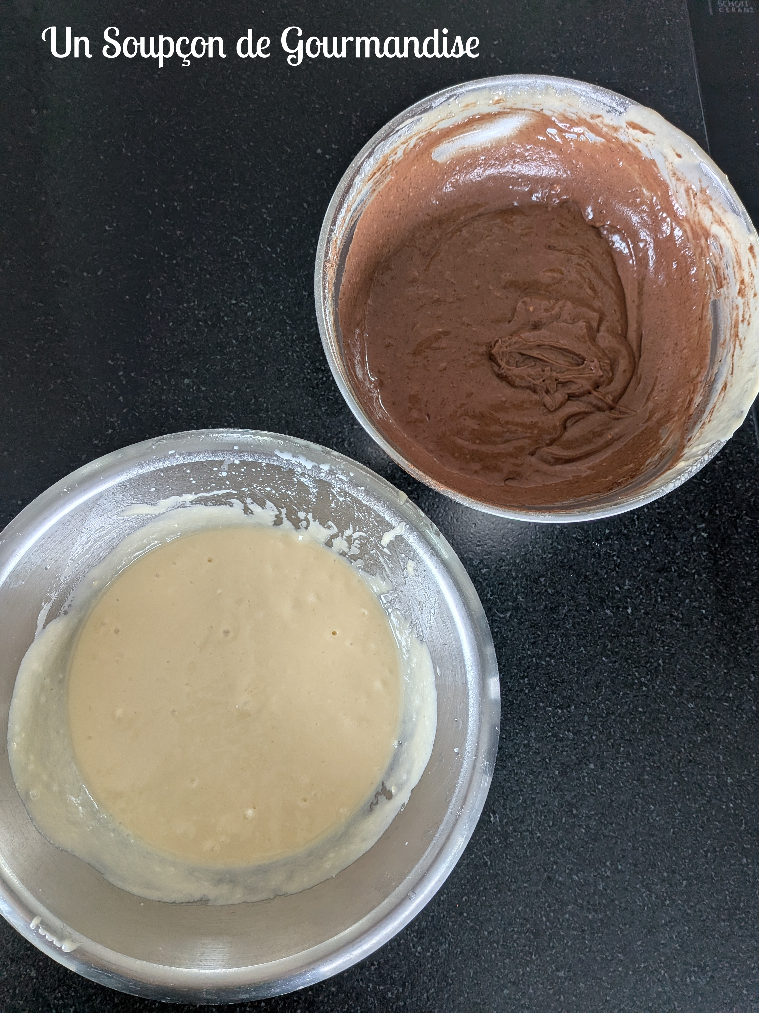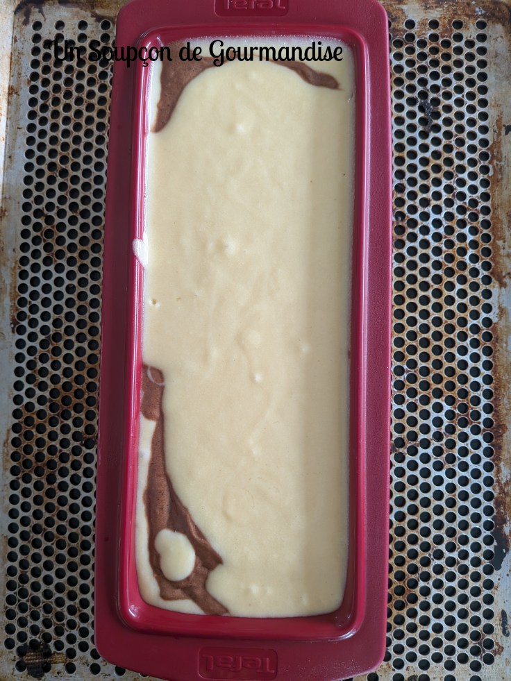 Verser 1/3 de la pâte nature dans le moule, puis la moitié de la pâte chocolatée, puis 1/3 de pâte nature, puis l’autre moitié de la pâte chocolatée et enfin le dernier 1/3 de pâte nature.