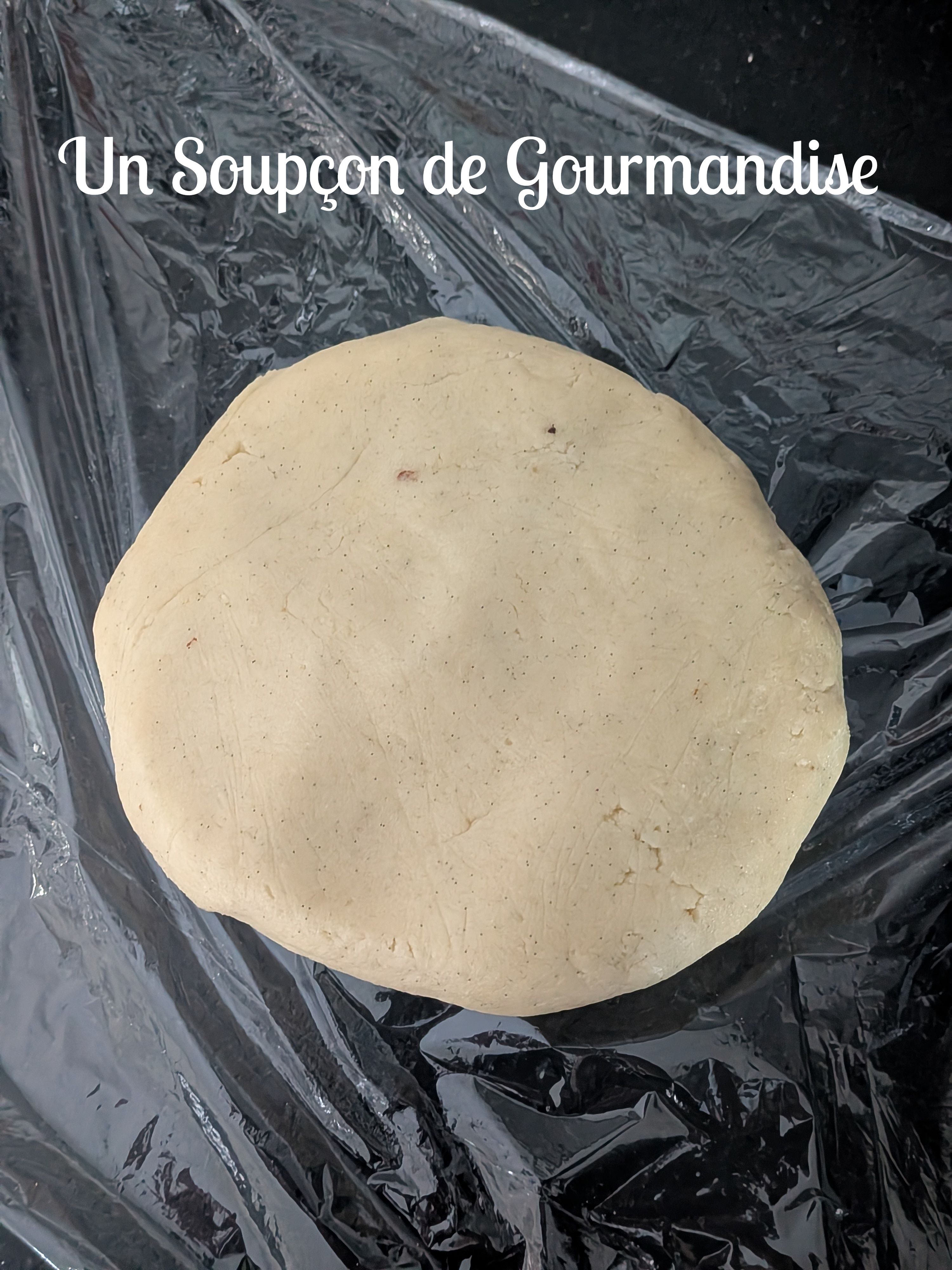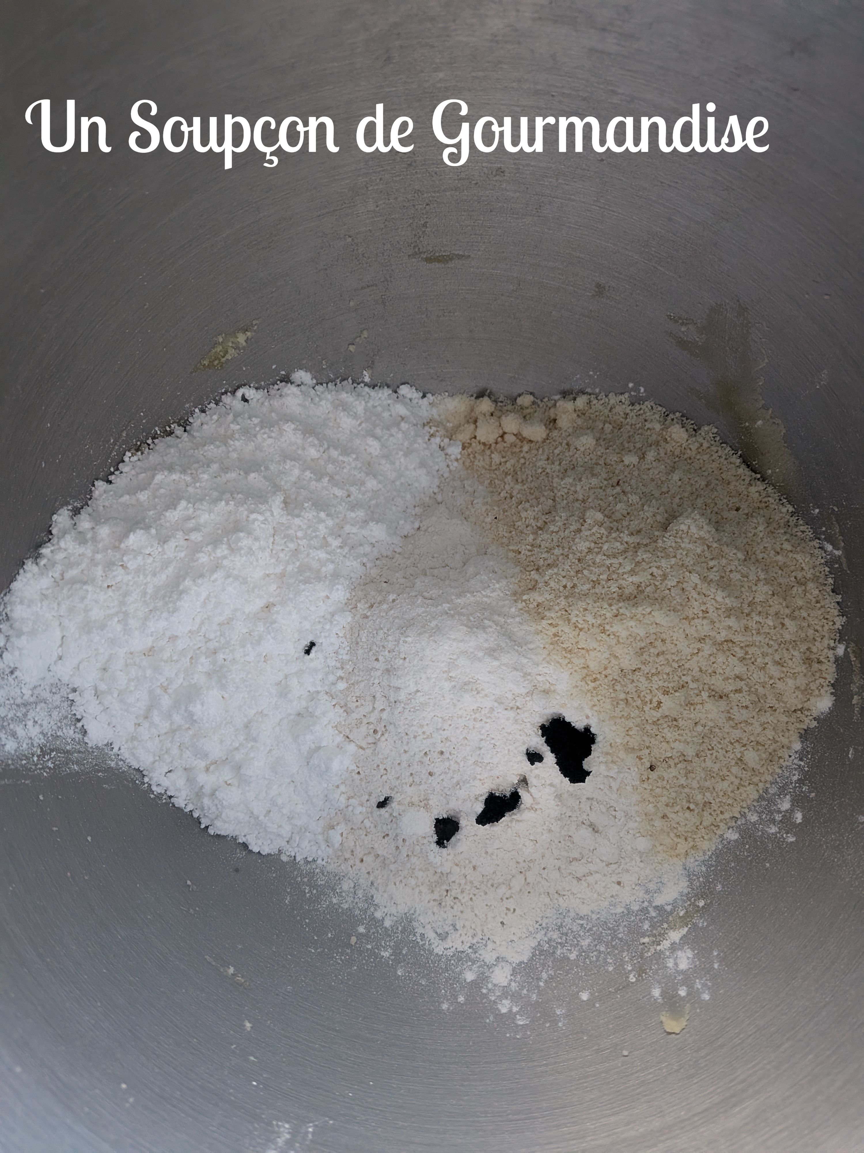 Dans le bol du robot muni de la feuille, verser 200g de farine T55, 30g de poudre d’amande, 55g de sucre glace et 1 pincée de sel. Ajouter les graines de la gousse de vanille, mélanger.