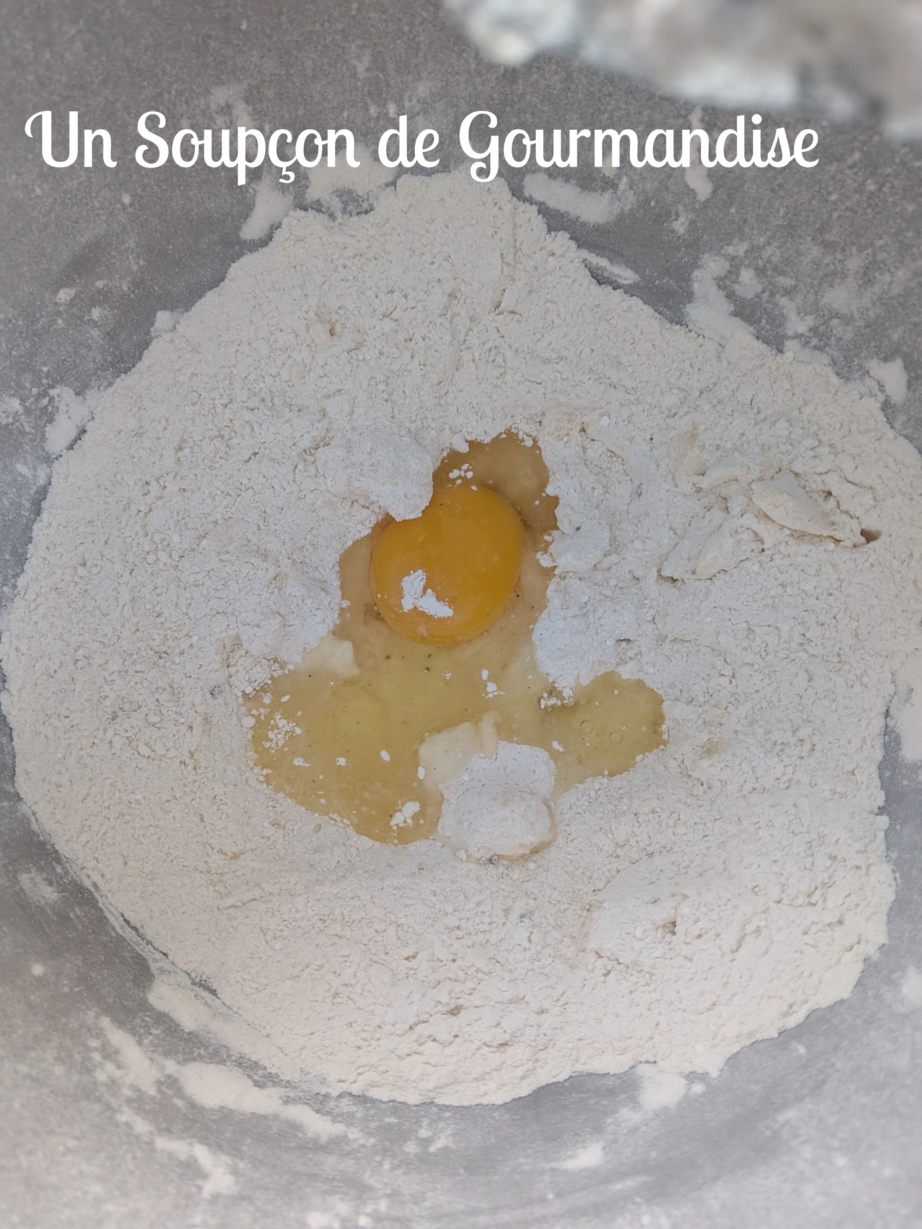 Ajouter 1 oeuf, et mélanger à nouveau jusqu’à ce que la pâte se décolle des parois. Former une boule et la placer dans un film étirable au réfrigérateur pour environ 2 heures.