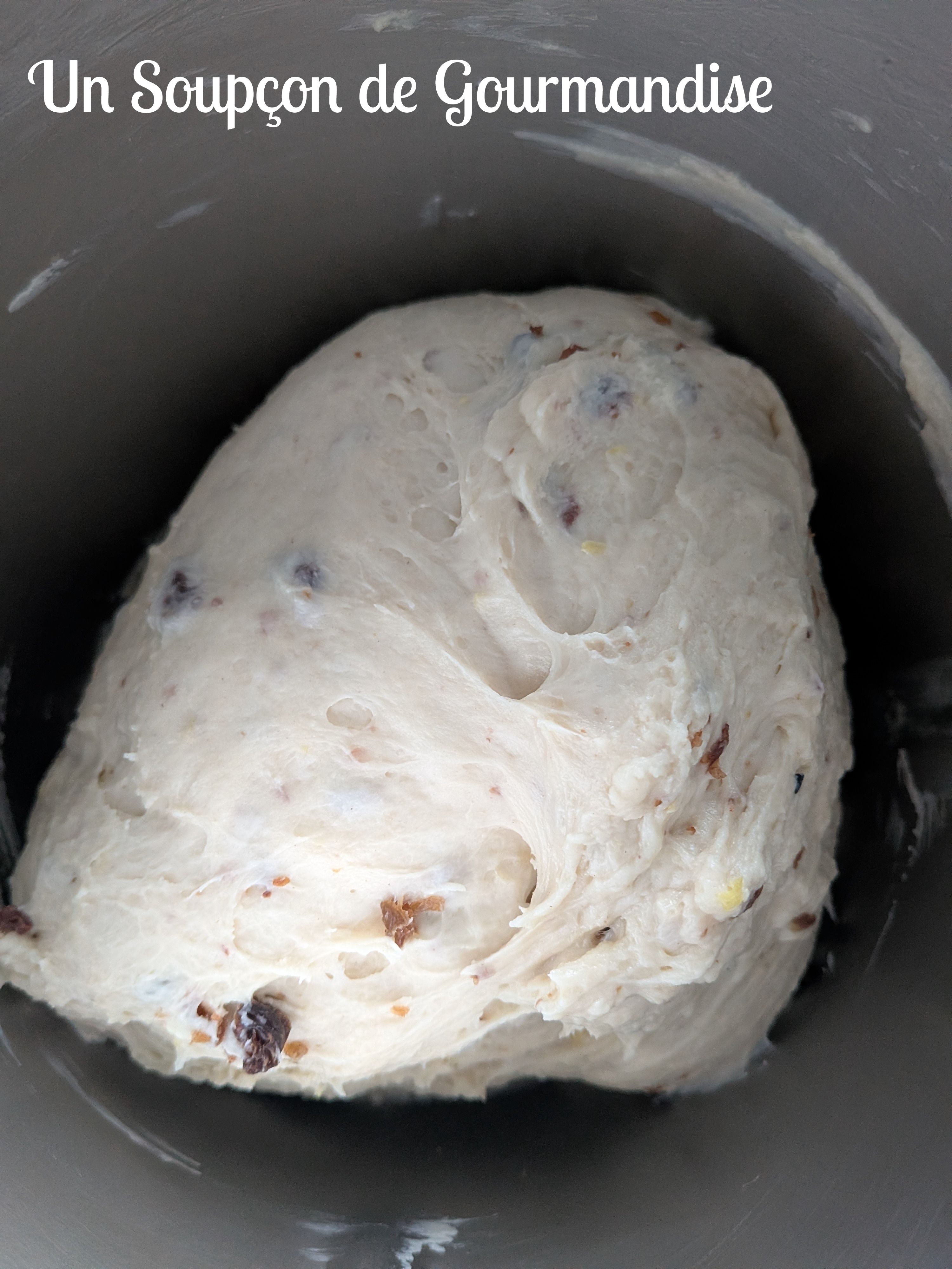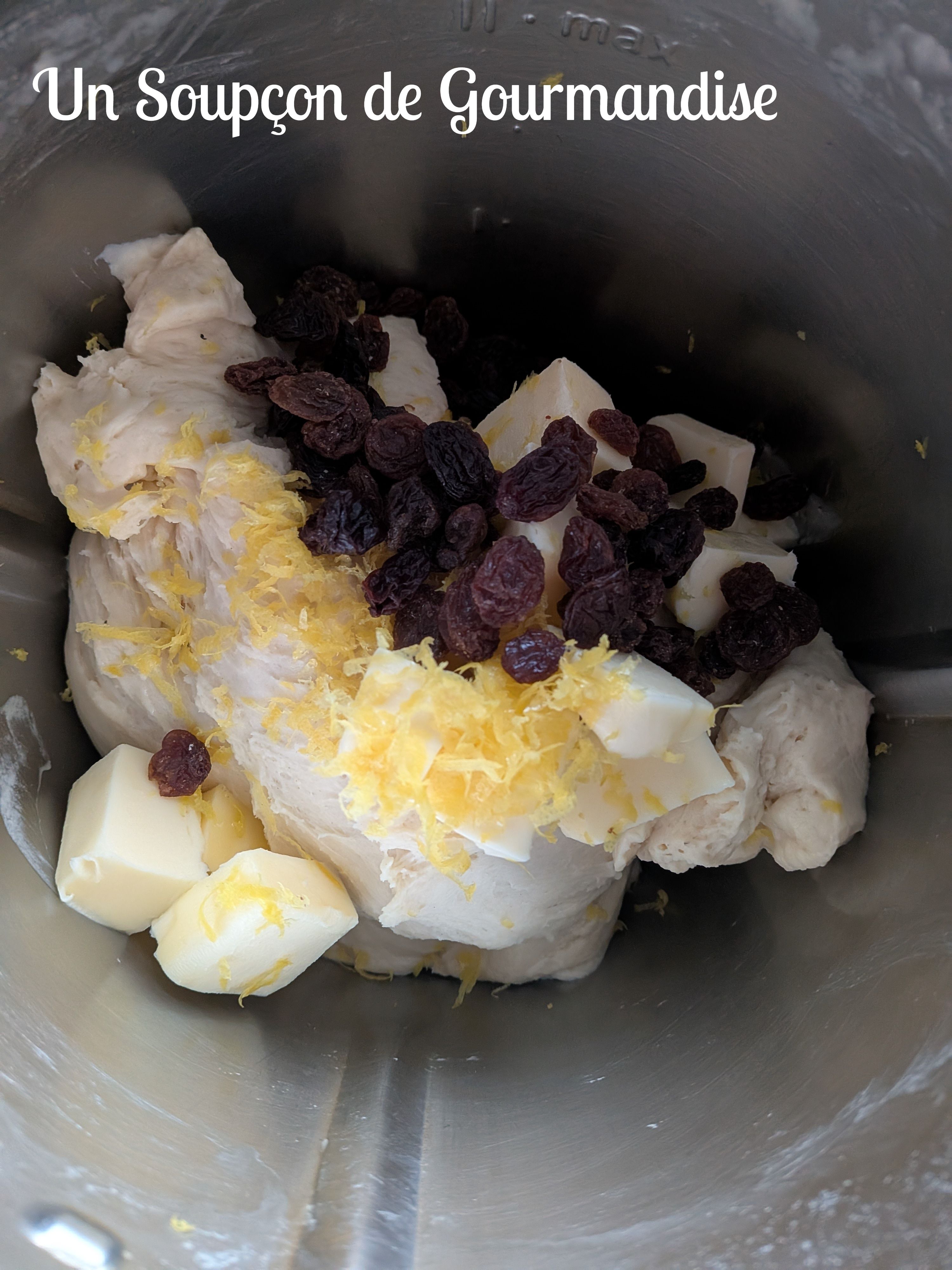 Ajouter 75g de beurre mou en petits morceaux, le zeste d’un demi citron bio et pétrir encore 10 minutes. Enfin, incorporer 4 cuillères à soupe de raisins secs dans la pâte.