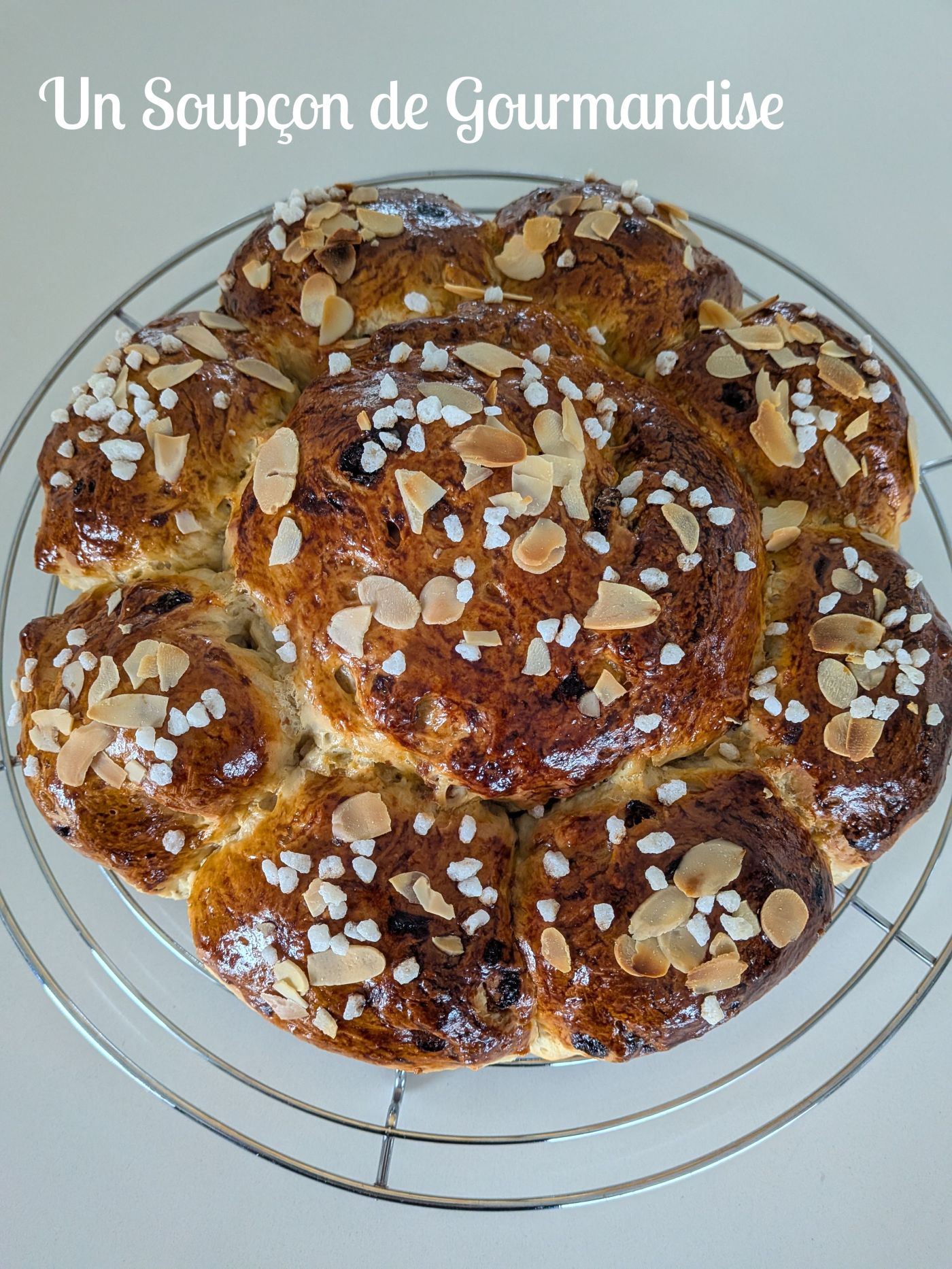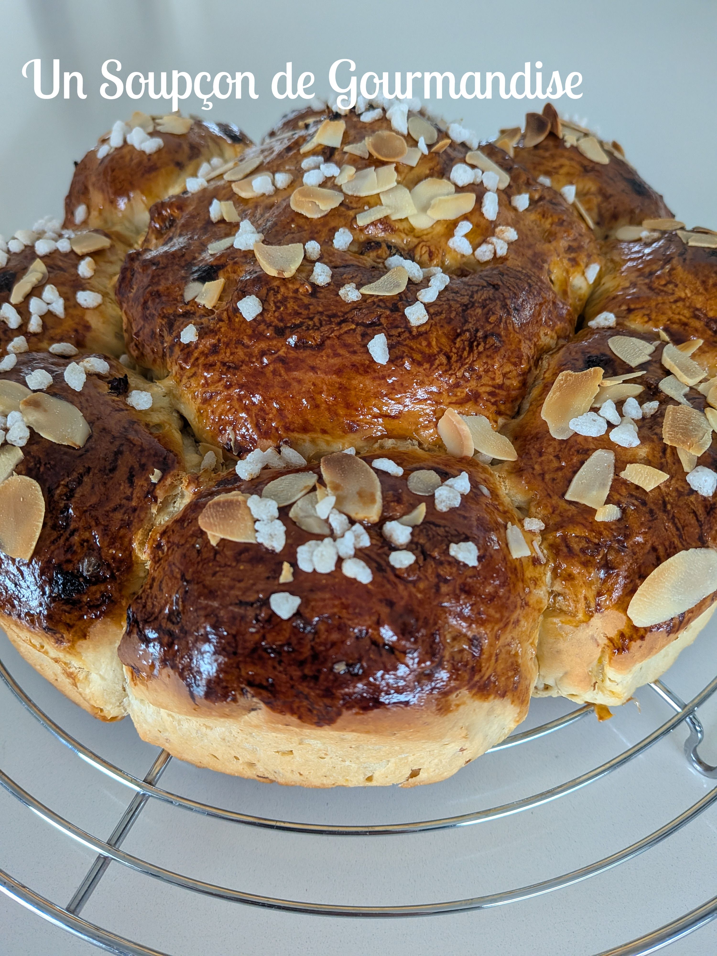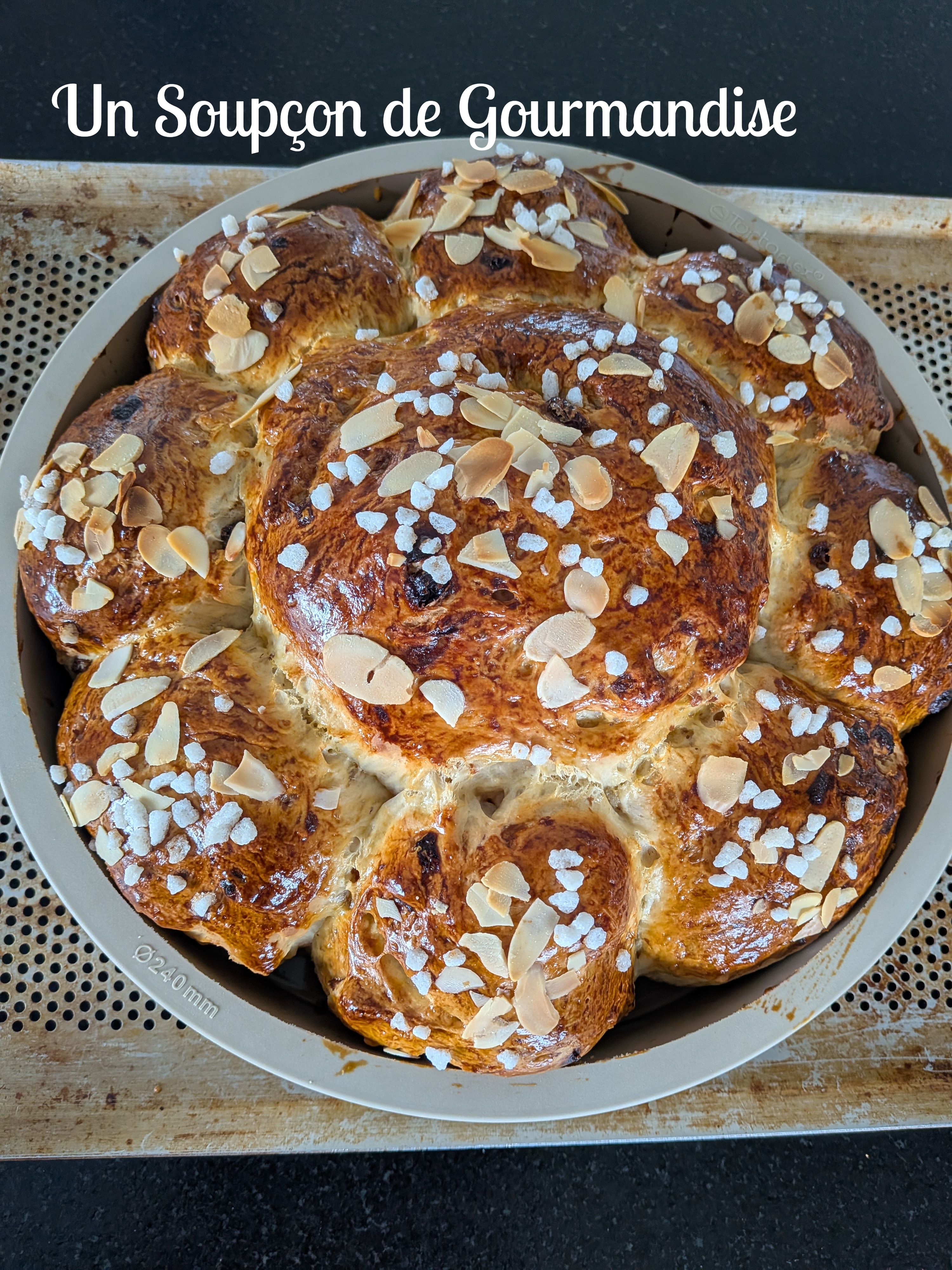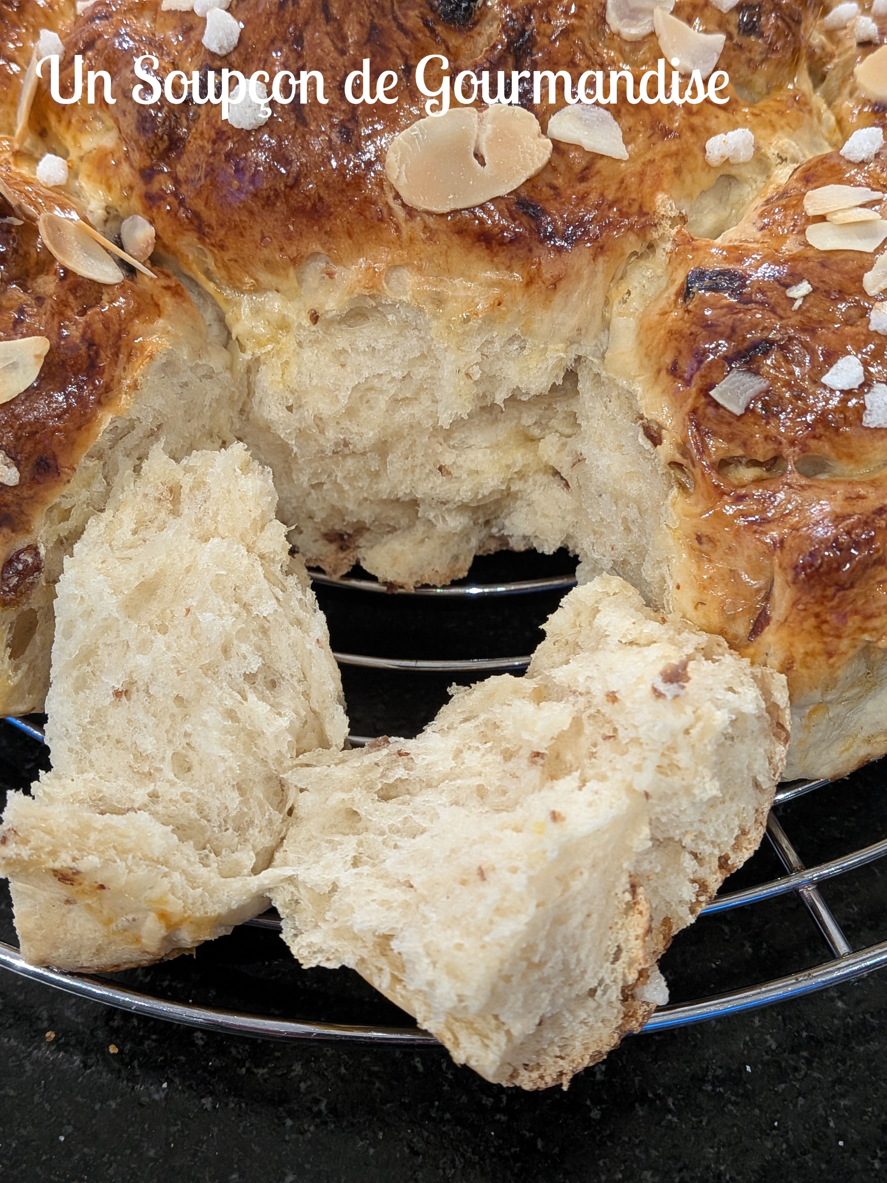 A la fin de cette seconde pousse, préchauffer le four à 180°C – chaleur tournante. Battre le jaune d’oeuf et dorer la brioche au pinceau à pâtisserie. Parsemer d’amandes effilées et de sucre en grains.