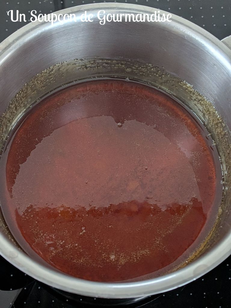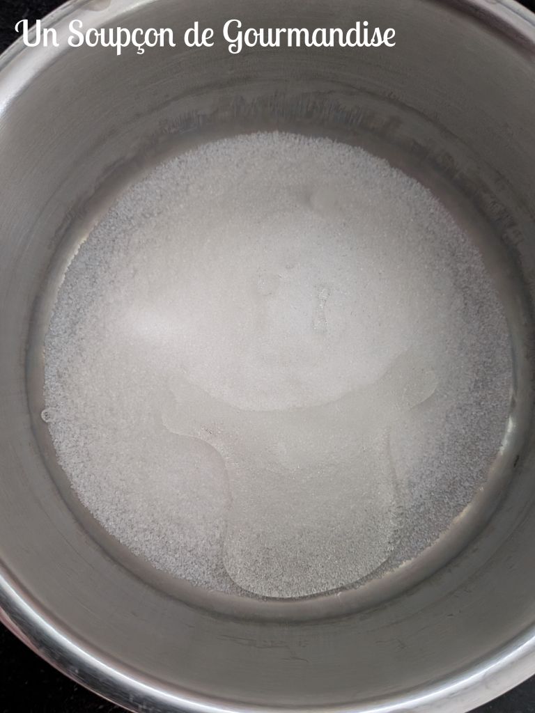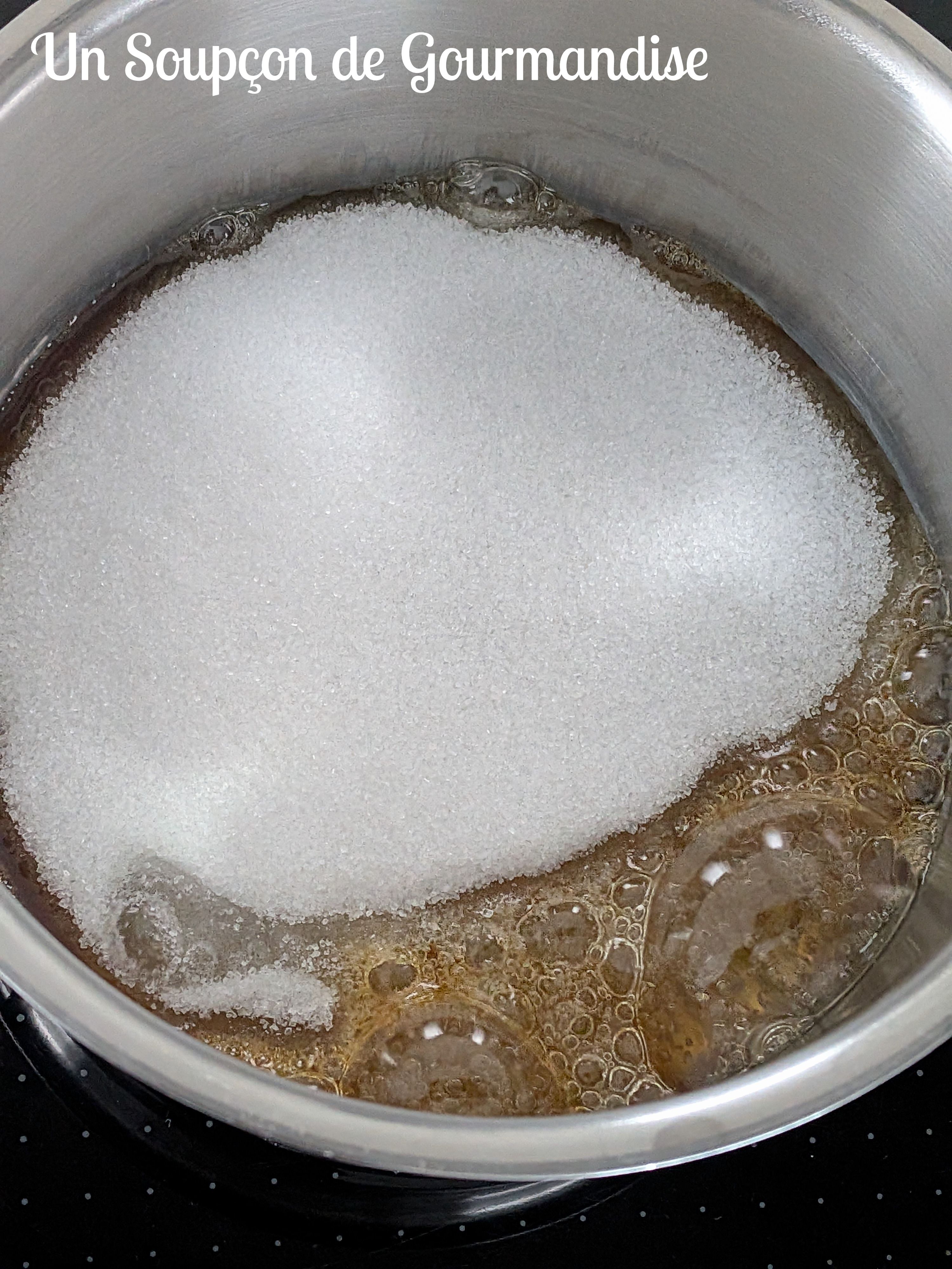 Dans une petite casserole à fond épais, faire chauffer 100g de sucre semoule et 15g de glucose jusqu’à obtention d’un caramel doré.
