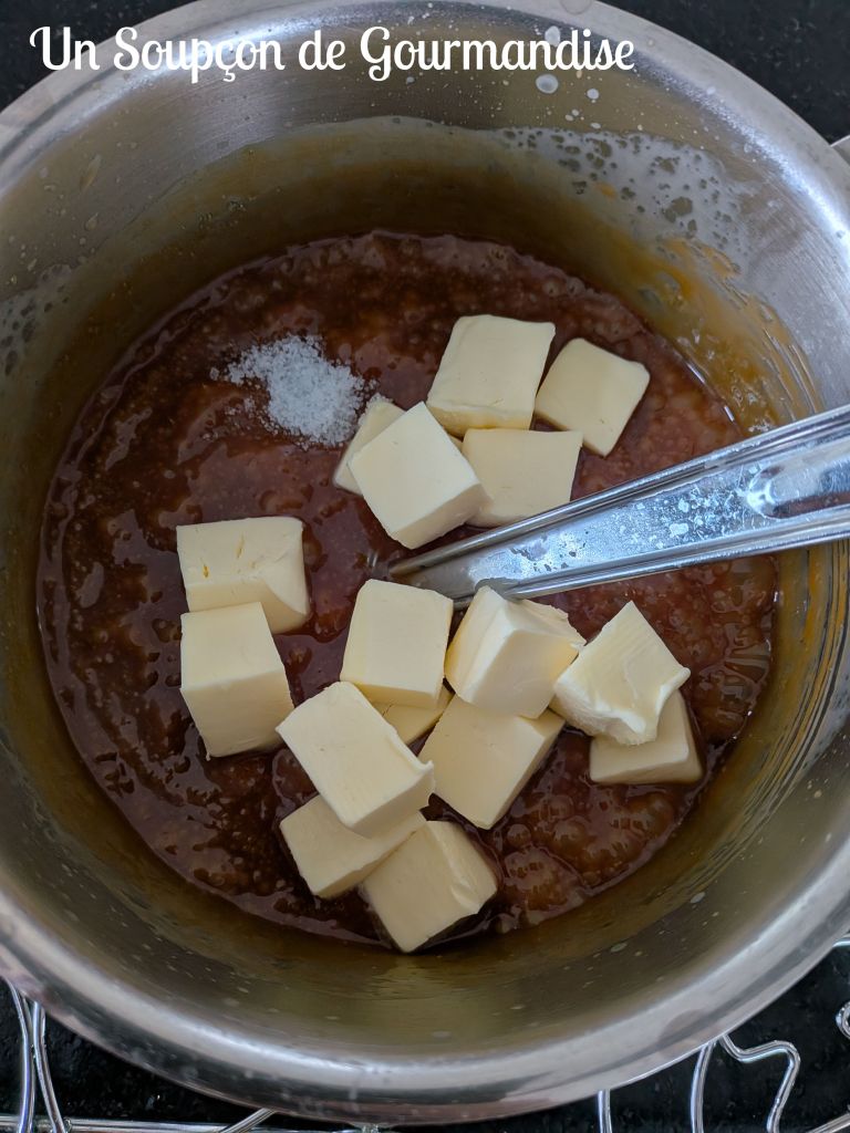 Hors du feu, ajouter 2g de fleur de sel et 80g de beurre froid en petits dés.